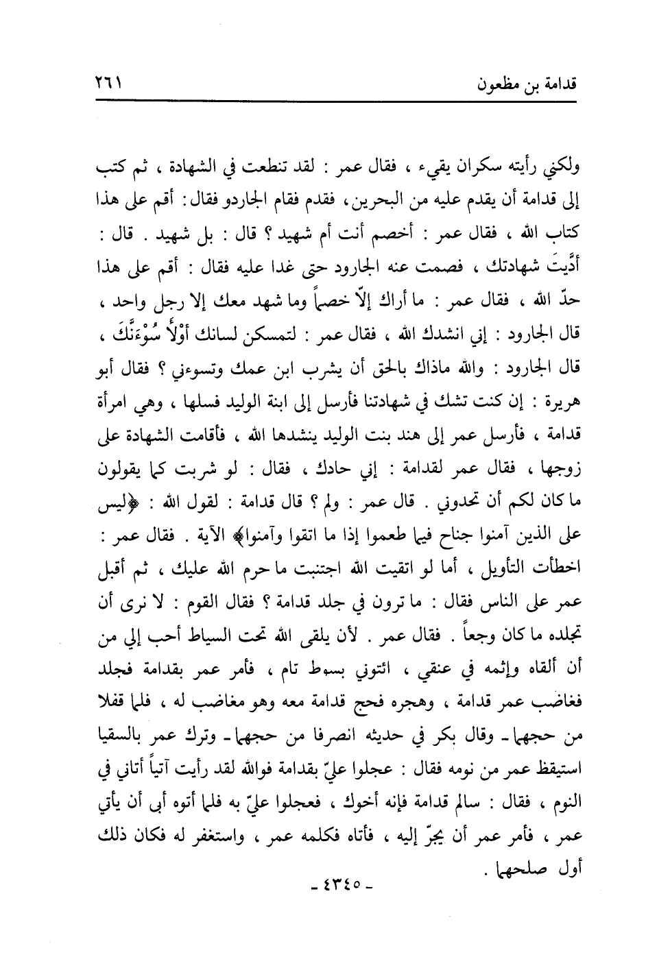 أَدَّيْتَ شَهَادَتَكَ، فَصَمَتَ عَنْهُ الْجَارُودُ حَتَّى غَدَا عَلَيْهِ فَقَالَ: أَقِمْ عَلَى هَذَا حَدَّ اللَّهِ، فَقَالَ عُمَرُ: مَا أَرَاكَ إِلا خَصْمًا وَمَا شَهِدَ مَعَكَ إِلا رَجُلٌ وَاحِدٌ، قَالَ الْجَارُودُ: إِنِّي أَنْشُدُكَ اللَّهَ، فَقَالَ عُمَرُ: لتمسكن لسانك أو لأسوءنّك، قَالَ الْجَارُودُ: وَاللَّهِ مَا ذَاكَ بِالْحَقِّ أَنْ يَشْرَبَ ابْنُ عَمِّكَ وَتَسُوءُنِي؟ فَقَالَ أَبُو هُرَيْرَةَ: إِنْ كُنْتَ تَشُكُّ فِي شَهَادَتِنَا فَأَرْسِلْ إِلَى ابْنَةِ الْوَليِدِ فَسَلْهَا، وَهِيَ امْرَأَةُ قُدَامَةَ، فَأَرْسَلَ عُمَرُ إِلَى هِنْدِ بِنْتِ الْوَليِدِ يَنْشُدُهَا اللَّهَ، فَأَقَامَتِ الشَّهَادَةَ عَلَى زَوْجِهَا، فَقَالَ عُمَرُ لِقُدَامَةَ: إِنِّي حَادُّكَ، فَقَالَ: لَوْ شَرِبْتُ كَمَا يَقُولُونَ مَا كَانَ لَكُمْ أَنْ تَحُدُّونِي. قَالَ عُمَرُ: وَلِمَ؟ قَالَ قُدَامَةُ: لِقَوْلِ اللَّهِ: (لَيْسَ عَلَى الذين آمنوا جُنَاحٌ فِيمَا طَعِمُوا إِذَا مَا اتَّقَوْا وَآمَنُوا) الآيَةَ. فَقَالَ عُمَرُ: