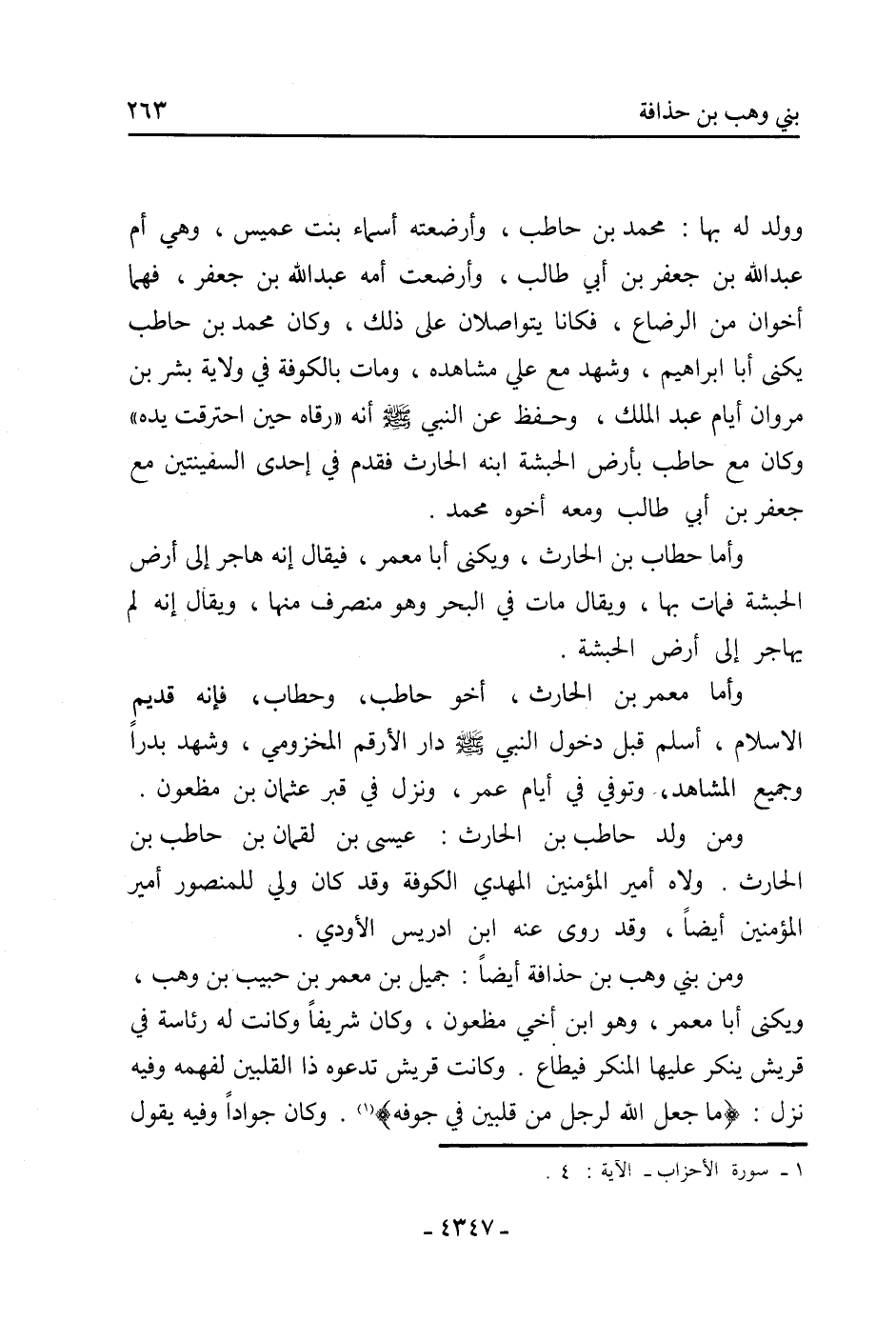 ويكنى أبا معمر، وَهُوَ ابْن أخي مظعون، وَكَانَ شريفا وكانت لَهُ رئاسة فِي قُرَيْش ينكر عَلَيْهَا المنكر فيطاع. وكانت قُرَيْش تدعوه ذا القلبين لفهمه وفيه نزل: (مَا جَعَلَ اللَّهُ لِرَجُلٍ مِنْ قَلْبَيْنِ في جوفه) [1] . وكان جوادا وفيه يقول