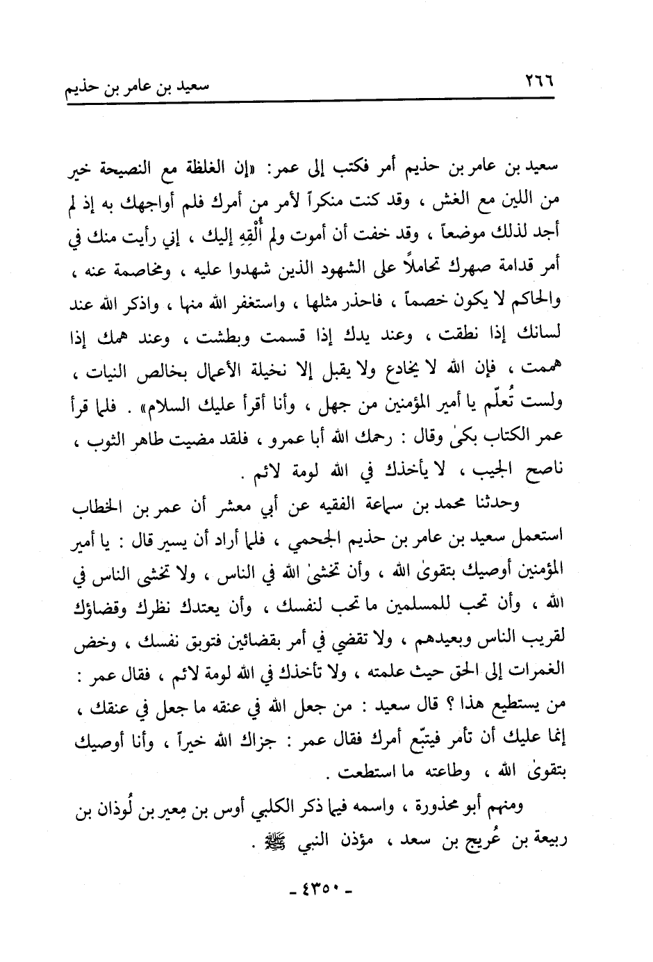 سَعِيدُ بْنُ عَامِرِ بْنِ حُذَيْمٍ أَمَرَ فَكُتِبَ إِلَى عُمَرَ: «إِنَّ الْغِلْظَةَ مَعَ النَّصِيحَةِ خَيْرٌ مِنَ اللِّينِ مَعَ الْغِشِّ، وَقَدْ كُنْتَ مُنْكِرًا لأَمْرِ مَنْ أَمْرِكَ فَلَمْ أُوَاجِهْكَ بِهِ إِذْ لَمْ أَجِدْ لِذَلِكَ مَوْضِعًا، وَقَدْ خِفْتُ أَنْ أَمُوتَ وَلَمْ أُلْقِهِ إِلَيْكَ، إِنِّي رَأَيْتُ مِنْكَ فِي أَمْرِ قُدَامَةَ صِهْرِكَ تَحَامُلا عَلَى الشُّهُودِ الَّذِينَ شَهِدُوا عَلَيْهِ، وَمُخَاصَمَةٍ عَنْهُ، وَالْحَاكِمُ لا يَكُونُ خَصْمًا، فَاحْذَرْ مِثْلَهَا، وَاسْتَغْفِرِ اللَّهَ مِنْهَا، وَاذْكُرِ اللَّهَ عِنْدَ لِسَانِكَ إِذَا نَطَقْتَ، وَعِنْدَ يَدِكَ إِذَا قَسَمْتَ وَبَطَشْتَ، وَعِنْدَ هَمِّكَ إِذَا هَمَمْتَ، فَإِنَّ اللَّهَ لا يُخَادِعُ وَلا يَقْبَلُ إِلا نَخِيلَةَ الأَعْمَالِ بِخَالِصِ النِّيَّاتِ، وَلَسْتَ تَعْلَمُ يَا أَمِيرَ الْمُؤْمِنِينَ مِنْ جَهْلٍ، وَأَنَا أَقْرَأُ عَلَيْكَ السَّلامَ» . فَلَمَّا قَرَأَ عُمَرُ الْكِتَابَ بَكَى وَقَالَ: رَحِمَكَ اللَّهُ أَبَا عَمْرٍو، فَلَقَدْ مَضَيْتَ طَاهِرَ الثَّوْبِ، نَاصِحَ الْجَيْبِ، لا يَأْخُذُكَ فِي اللَّهِ لَوْمَةُ لائِمٍ.
