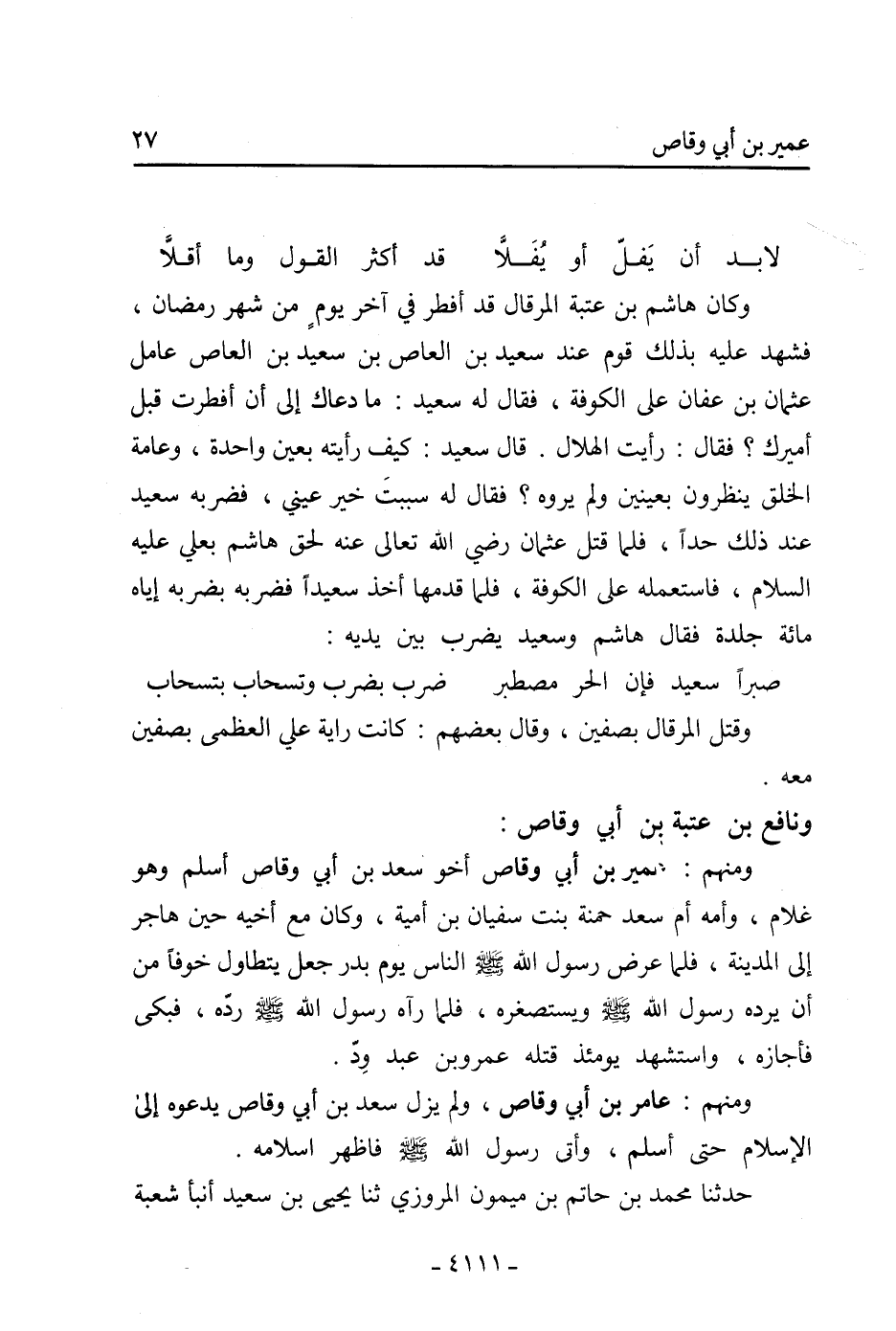 وَكَانَ هاشم بْن عتبة المرقال قد أفطر فِي آخر يَوْم من شهر رمضان، فشهد عليه بذلك قوم عند سَعِيد بْن العاص بْن سَعِيد بْن العاص عامل عُثْمَان بْن عَفَّان عَلَى الكوفة، فقال له سَعِيد: كيف رأيته بعين واحدة، وعامة الخلق ينظرون بعينين ولم يروه؟ فَقَالَ لَهُ سببت خير عيني، فضربه سَعِيد عند ذَلِكَ حدا، فلما قتل عُثْمَان رَضِيَ اللَّهُ تَعَالَى عَنْهُ لحق هاشم بعلي عَلَيْهِ السلام، فاستعمله عَلَى الْكُوفَة، فلما قدمها أخذ سعيدا فضربه بضربة إياه مائة جلدة فَقَالَ هاشم وسعيد يضرب بين يديه: