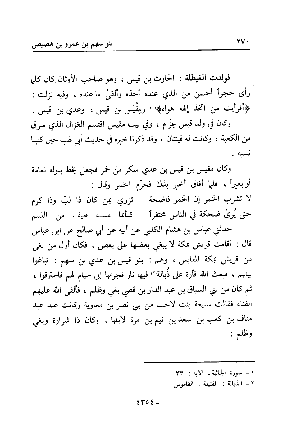 حَدَّثَنِي عَبَّاس بْن هِشَام الْكَلْبِيّ عَن أَبِيهِ عَنْ أَبِي صَالِحٍ عَنِ ابْنِ عَبَّاسٍ قَالَ: أقامت قُرَيْش بِمَكَّةَ لا يبغي بعضها عَلَى بعض، فكان أول من بغى من قُرَيْش بِمَكَّةَ المقايس، وهم: بنو قَيْس بْن عدي بْن سهم: تباغوا بينهم، فبعث اللَّه فأرة عَلَى ذبالة [2] فِيهَا نار فجرتها إِلَى خيام لهم فاحترقوا، ثُمَّ كَانَ من بني السباق بْن عَبْدِ الدار بْن قصي بغي وظلم، فألقى اللَّه عَلَيْهِم الفناء فقالت سبيعة بِنْت لاحب من بني نصر بْن مُعَاوِيَة وكانت عند عبد مَنَاف بْن كعب بْن سَعْد بْن تيم بْن مرة لابنها، وكان ذا شرارة وبغي وظلم:
