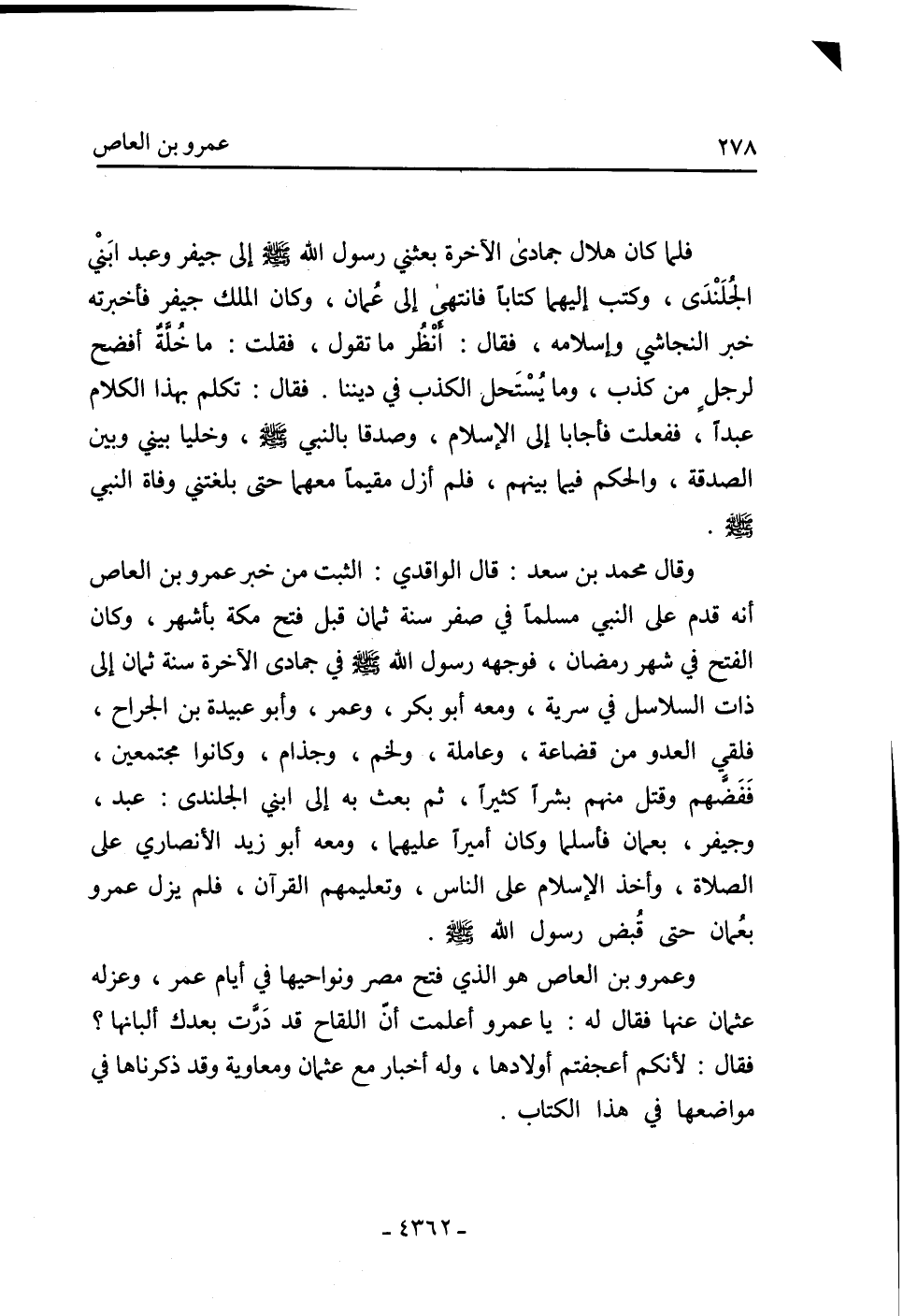 وَقَالَ مُحَمَّد بْن سَعْد: قَالَ الْوَاقِدِيُّ: الثبت من خبر عَمْرو بْن الْعَاصِ أنه قدم عَلَى النَّبِيّ مسلما فِي صفر سنة ثمان قبل فتح مَكَّة بأشهر، وَكَانَ الفتح فِي شهر رمضان، فوجهه رَسُول اللَّهِ صَلَّى اللَّهُ عَلَيْهِ وَسَلَّمَ فِي جمادى الآخرة سنة ثمان إِلَى ذات السلاسل فِي سرية، ومعه أَبُو بَكْرٍ، وَعُمَرُ، وَأَبُو عُبَيْدَةَ بْن الْجَرَّاحِ، فلقي العدو من قضاعة، وعاملة، ولخم، وجذام، وكانوا مجتمعين، ففضهم وقتل منهم بشرا كثيرا، ثُمَّ بعث بِهِ إِلَى ابني الجلندي: عبد، وجيفر، بعمان فأسلما وَكَانَ أميرا عليهما، ومعه أَبُو زَيْد الأَنْصَارِيّ عَلَى الصلاة، وأخذ الإِسْلام عَلَى النَّاس، وتعليمهم الْقُرْآن، فلم يزل عَمْرو بعمان حَتَّى قبض رَسُول اللَّهِ صَلَّى اللَّهُ عَلَيْهِ وَسَلَّمَ.