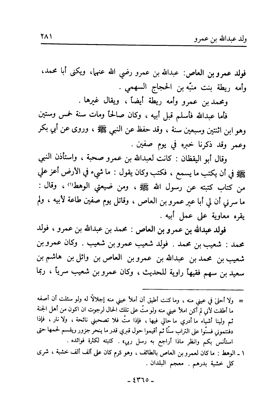 وَكَانَ عَمْرو بْن شُعَيْب بْن مُحَمَّد بْن عَبْدِ اللَّهِ بْن عَمْرو بْن الْعَاصِ بْن وائل بْن هاشم بْن سَعِيد بْن سهم فقيها راوية للحديث، وَكَانَ عمرو بن شعيب سريا، ربما ولا أحلى في عيني منه، وما كنت أطيق أن أملأ عيني منه إجلالا له ولو سئلت أن أصفه ما أطقت لأني لم أكن املأ عيني منه ولو متّ على تلك الحال لرجوت ان أكون من أهل الجنة ثم ولينا أشياء ما أدري ما حالي فيها، فإذا متّ فلا تصحبني نائحة، ولا نار، فإذا دفنتموني فسنّوا على التراب سنّا ثم أقيموا حول قبري قدر ما ينحر جزور ويقسم لحمها حتى استأنس بكم وانظر ماذا أراجع به رسل ربي» . كتبته لكثرة فوائده.