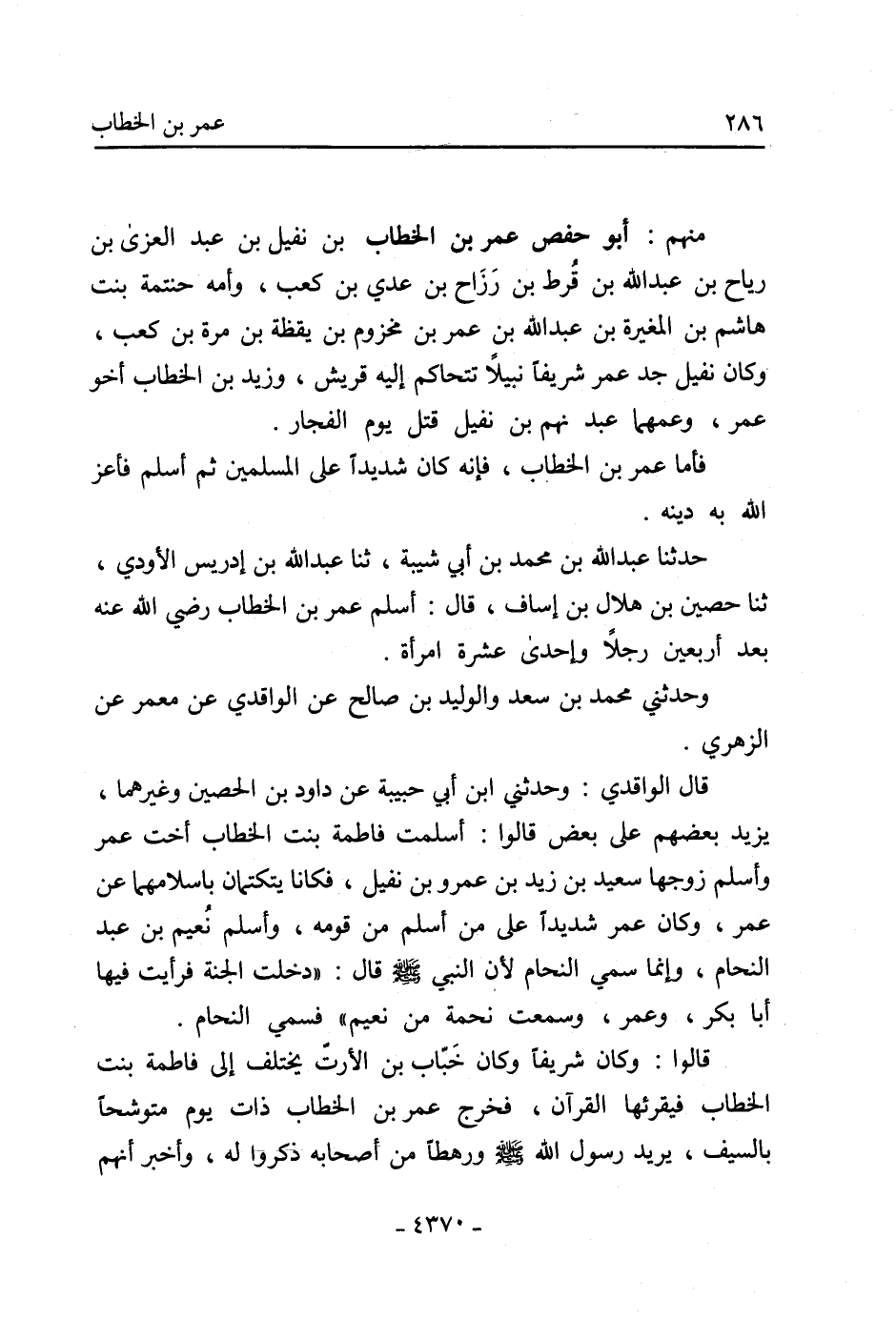 قَالَ الْوَاقِدِيُّ: وَحَدَّثَنِي ابْنِ أَبِي حَبِيبَةَ عَنْ دَاوُدَ بْنِ الْحُصَيْنِ وغيرهما، يَزِيد بعضهم عَلَى بعض قَالُوا: أسلمت فاطمة بِنْت الخطاب أخت عمر وأسلم زوجها سَعِيد بْن زَيْد بْن عَمْرِو بْنِ نفيل، فكانا يتكتمان بإسلامهما عَن عمر، وَكَانَ عمر شديدا عَلَى من أسلم من قومه، وأسلم نعيم بْن عَبْدِ النحام، وإنما سمي النحام لأَنَّ النَّبِيَّ صَلَّى اللَّهُ عَلَيْهِ وَسَلَّمَ قَالَ: [ «دخلت الجنة فرأيت فِيهَا أَبَا بَكْرٍ، وَعُمَرَ، وسمعت نحمة من نعيم» ] فسمي النحام.
