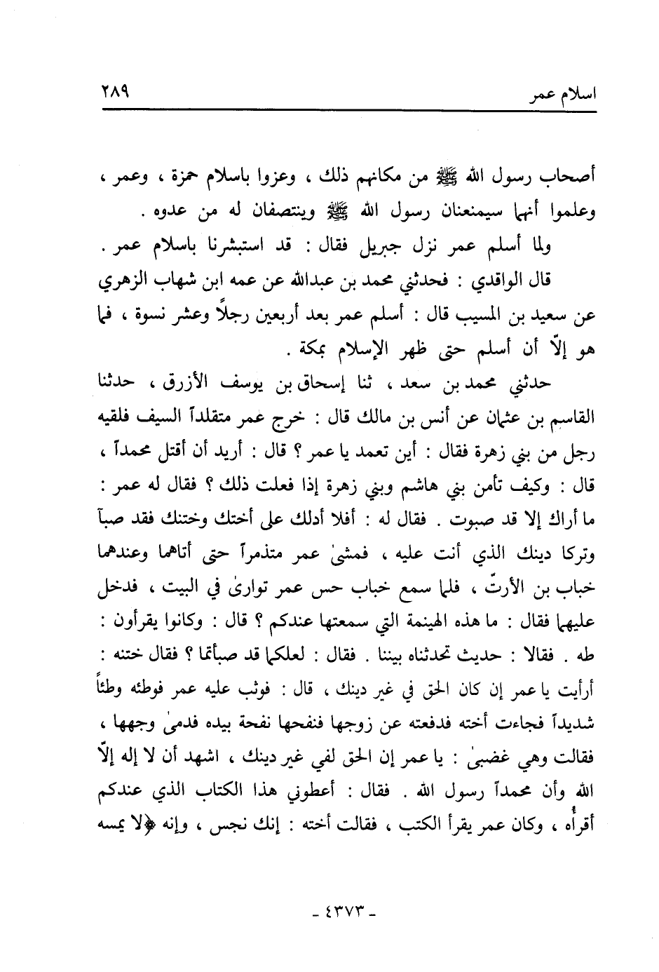 أَرَأَيْتَ يَا عُمَرُ إِنْ كَانَ الْحَقُّ فِي غَيْرِ دِينِكَ، قَالَ: فَوَثَبَ عَلَيْهِ عُمَرُ فَوَطِئَهُ وَطْئًا شَدِيدًا فَجَاءَتْ أُخْتُهُ فَدَفَعَتْهُ عَنْ زَوْجِهَا فَنَفَحَهَا نَفْحَةً بِيَدِهِ فَدَمَى وَجْهُهَا، فَقَالَتْ وَهِيَ غَضْبَى: يَا عُمَرُ إِنَّ الْحَقَّ لَفِي غَيْرِ دِينِكَ، أَشْهَدُ أَنْ لا إِلَهَ إِلا اللَّه وَأَنَّ مُحَمَّدًا رَسُولُ اللَّهِ. فَقَالَ: أَعْطُونِي هَذَا الْكِتَابَ الَّذِي عِنْدَكُمْ أَقْرَأُهُ، وَكَانَ عُمَرُ يَقْرَأُ الْكُتُبَ، فَقَالَتْ أُخْتُهُ: إِنَّكَ نَجِسٌ، وَإِنَّهُ (لا يمسه