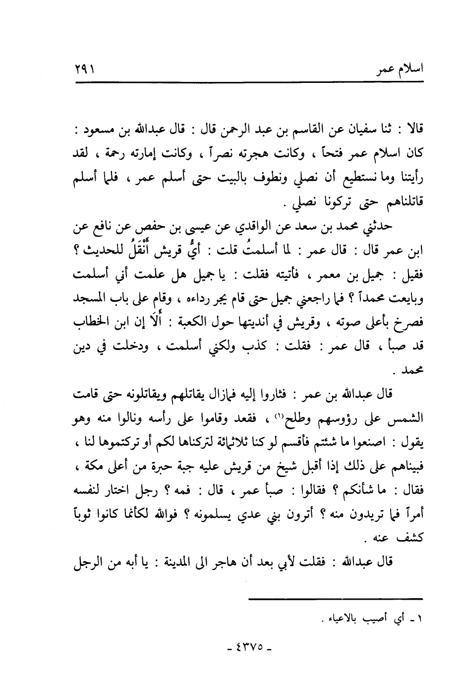حَدَّثَنِي مُحَمَّدُ بْنُ سَعْدٍ عَنِ الْوَاقِدِيِّ عَنْ عِيسَى بْنِ حَفْصٍ عَنْ نَافِعٍ عَنِ ابْنِ عُمَرَ قَالَ: قَالَ عُمَرُ: لَمَّا أَسْلَمْتُ قُلْتُ: أَيُّ قُرَيْشٍ أَنْقَلُ لِلْحَدِيثِ؟