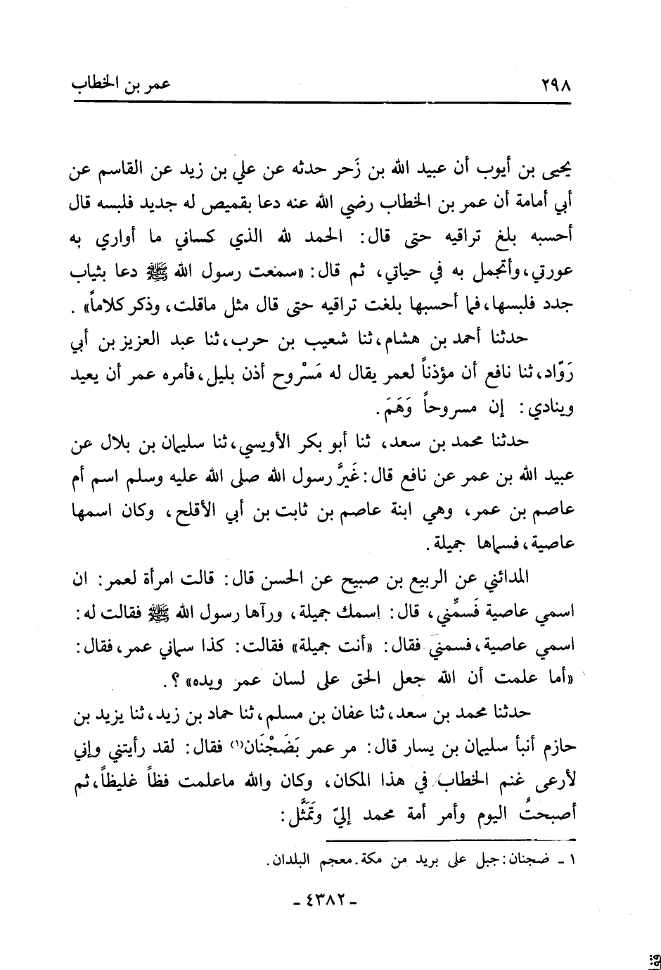 حَدَّثَنَا مُحَمَّدُ بْنُ سَعْدٍ، ثنا عَفَّانُ بْنُ مُسْلِمٍ، ثنا حماد بن زيد، ثنا يَزِيدُ بْنُ حَازِمٍ أنبأ سُلَيْمَانُ بْنُ يَسَارٍ قَالَ: مَرَّ عُمَرُ بِضَجْنَانَ [1] فَقَالَ: لَقَدْ رَأَيْتُنِي وَإِنِّي لأَرْعَى غَنَمَ الْخَطَّابِ فِي هَذَا الْمَكَانِ، وَكَانَ وَاللَّهِ مَا عَلِمْتُ فَظًّا غَلِيظًا، ثُمَّ أَصْبَحْتُ الْيَوْمَ وَأَمْرُ أُمَّةِ مُحَمَّدٍ إِلَيَّ وَتَمَثَّلَ: