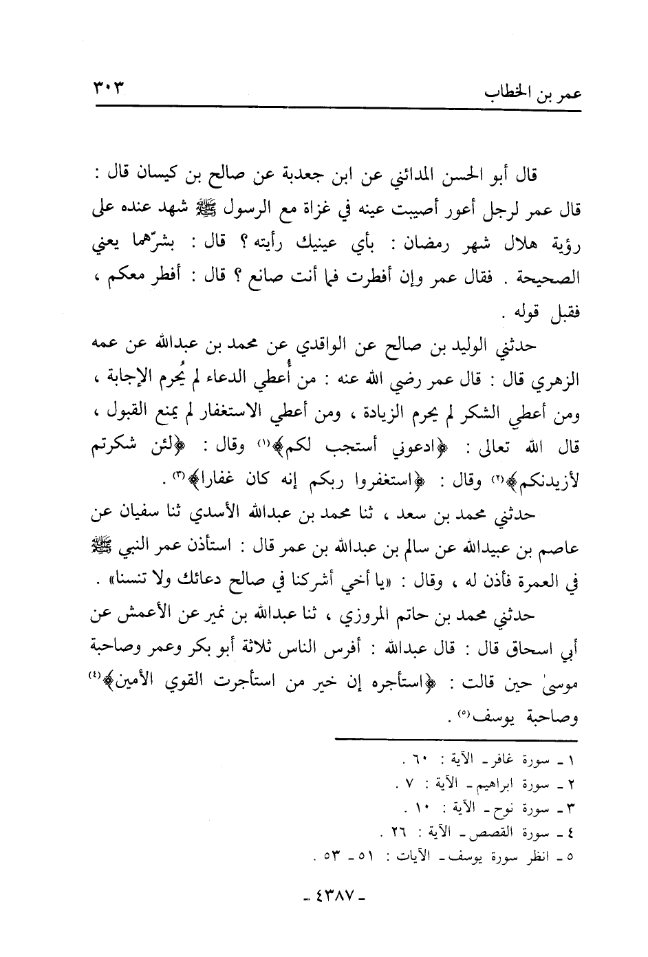 حَدَّثَنِي الْوَلِيدُ بْنُ صَالِحٍ عَنِ الْوَاقِدِيِّ عَنِ مُحَمَّدِ بْنِ عَبْدِ اللَّهِ عن عَمِّهِ الزُّهْرِيِّ قَالَ: قَالَ عُمَرُ رَضِيَ اللَّهُ عَنْهُ: مَنْ أُعْطِيَ الدُّعَاءَ لَمْ يُحْرَمِ الإِجَابَةَ، وَمَنْ أُعْطِيَ الشُّكْرَ لَمْ يُحْرَمِ الزِّيَادَةَ، وَمَنْ أُعْطِيَ الاسْتِغْفَارَ لَمْ يُمْنَعَ الْقَبُولَ، قَالَ اللَّهُ تعالى: (ادعوني أستجب لكم) [1] وقال: (لئن شكرتم لأزيدنكم) [2] وقال: (استغفروا ربكم إنه كان غفارا) [3] .