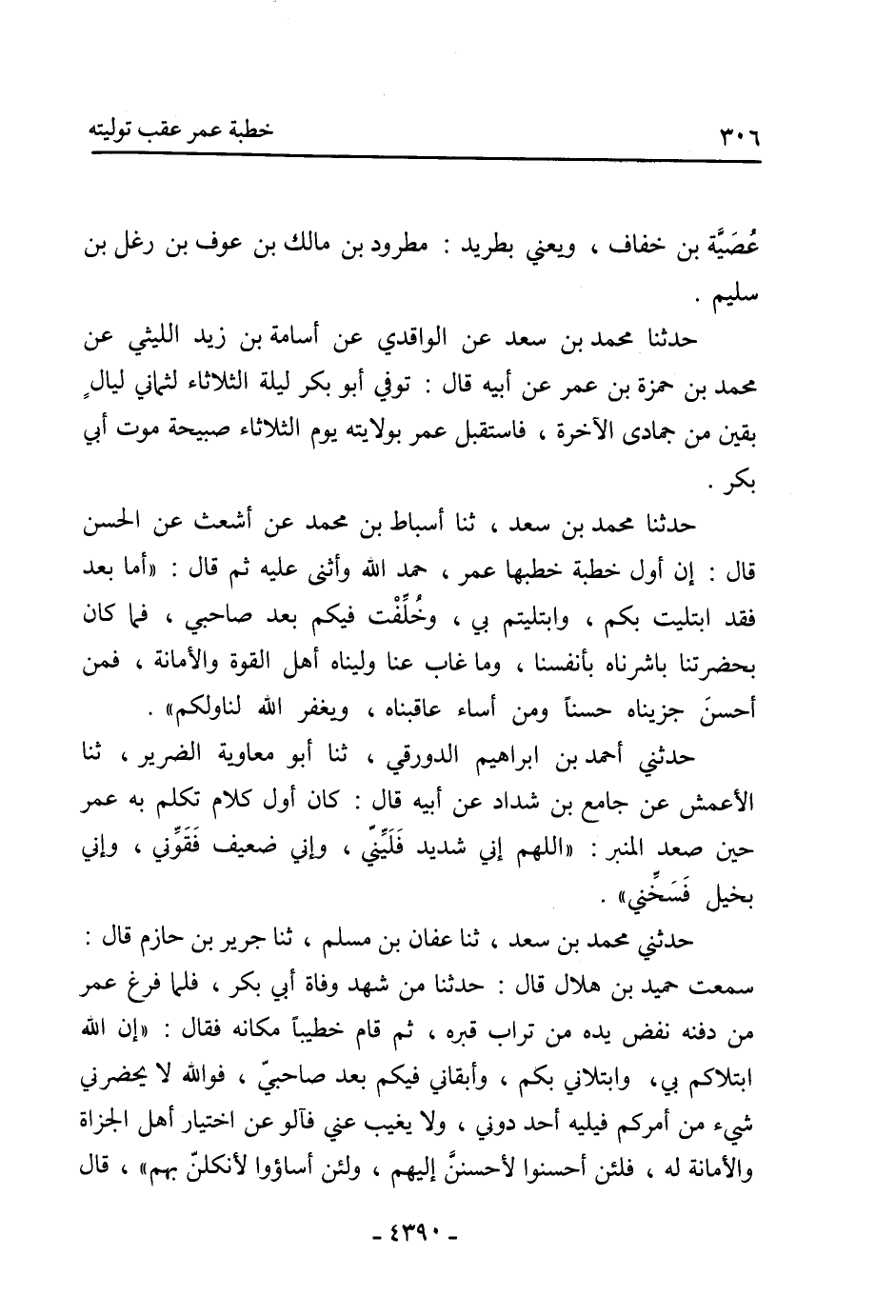 حَدَّثَنَا مُحَمَّدُ بْنُ سَعْدٍ، ثنا أَسْبَاطُ بْنُ مُحَمَّدٍ عَنْ أَشْعَثَ عَنِ الْحَسَنِ قَالَ: إِنَّ أَوَّلَ خُطْبَةٍ خَطَبَهَا عُمَرُ، حَمِدَ اللَّه وَأَثْنَى عَلَيْهِ ثُمَّ قَالَ: «أَمَّا بَعْدُ فَقَدِ ابْتُلِيتُ بِكُمْ، وَابْتُلِيتُمْ بِي، وَخُلِّفْتُ فِيكُمْ بَعْدَ صَاحِبِي، فَمَا كَانَ بِحَضْرَتِنَا بَاشَرْنَاهُ بِأَنْفُسِنَا، وَمَا غَابَ عَنَّا وَلَّيْنَاهُ أَهْلَ الْقُوَّةِ وَالأَمَانَةِ، فَمَنْ أَحْسَنَ جَزَيْنَاهُ حُسْنًا وَمَنْ أَسَاءَ عَاقَبْنَاهُ، وَيَغْفِرُ اللَّهُ لناولكم» .