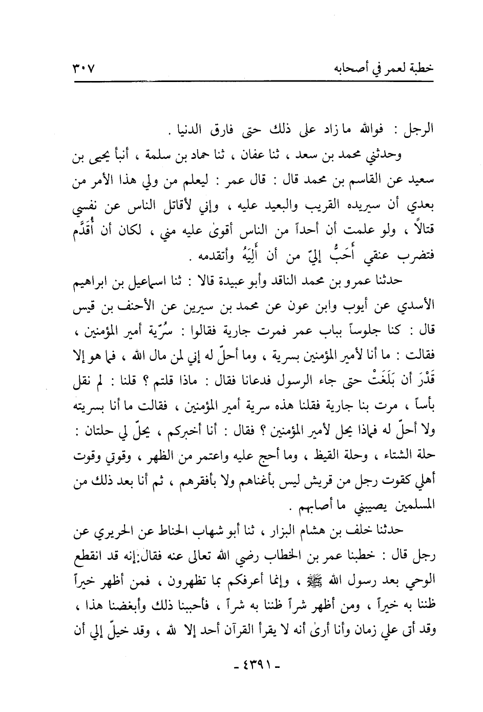 وَحَدَّثَنِي مُحَمَّدُ بْنُ سَعْدٍ، ثنا عَفَّانُ، ثنا حَمَّادُ بْنُ سَلَمَةَ، أَنْبَأَ يَحْيَى بْنُ سَعِيدٍ عَنِ الْقَاسِمِ بْنِ مُحَمَّدٍ قَالَ: قَالَ عُمَرُ: لِيَعْلَمَ مَنْ وَلِيَ هَذَا الأَمْرَ مِنْ بَعْدِي أَنْ سَيُرِيدُهُ الْقَرِيبُ وَالْبَعِيدُ عَلَيْهِ، وَإِنِّي لأُقَاتِلُ النَّاسَ عَنْ نَفْسِي قِتَالا، وَلَوْ عَلِمْتُ أَنَّ أَحَدًا مِنَ النَّاسِ أَقْوَى عَلَيْهِ مِنِّي، لَكَانَ أَنْ أُقَدَّمَ فَتُضْرَبُ عُنُقِي أَحَبُّ إِلَيَّ مِنْ أن أليه وأتقدمه.