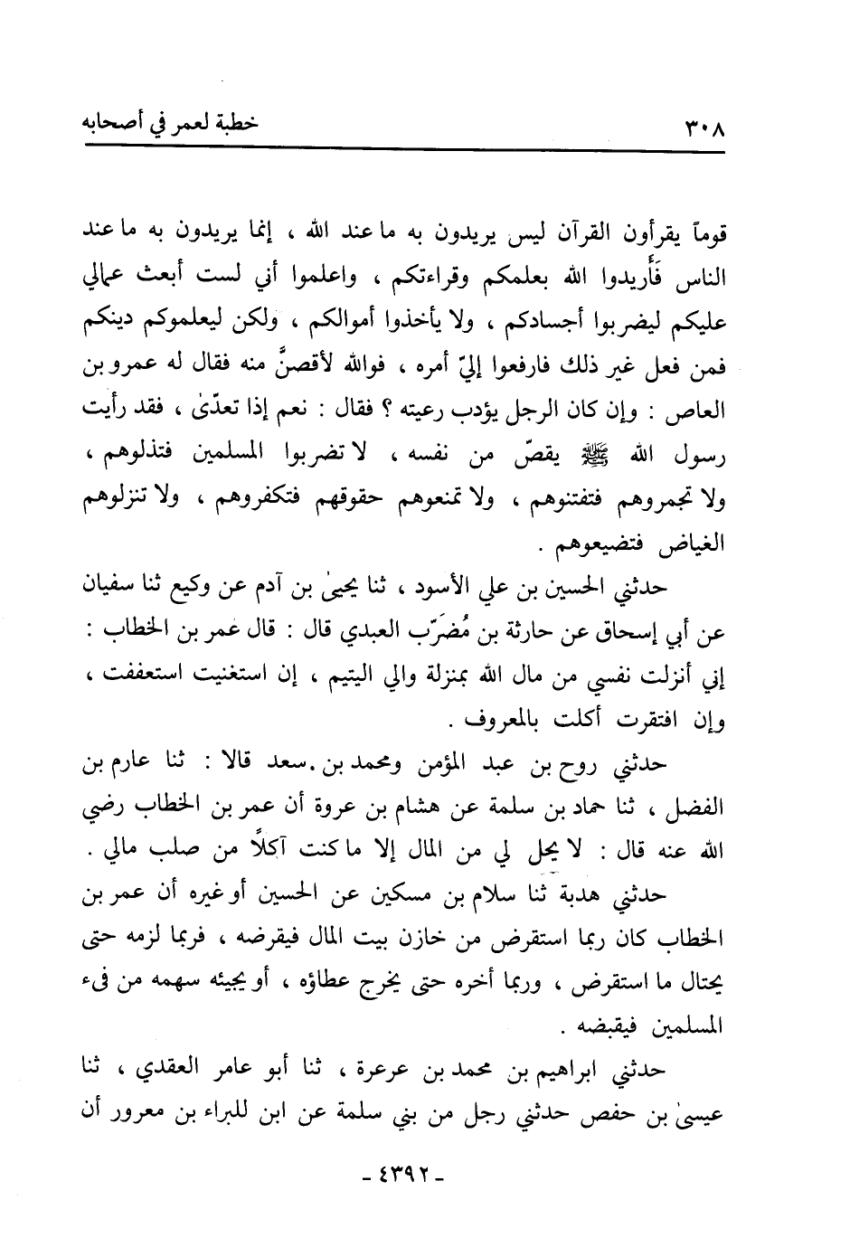 قَوْمًا يَقْرَأُونَ الْقُرْآنَ لَيْسَ يُرِيدُونَ بِهِ مَا عِنْدَ اللَّهِ، إِنَّمَا يُرِيدُونَ بِهِ مَا عِنْدَ النَّاسِ فَأَرِيدُوا اللَّهَ بِعِلْمِكُمْ وَقِرَاءَتِكُمْ، وَاعْلَمُوا أَنِّي لَسْتُ أَبْعَثُ عُمَّالِي عَلَيْكُمْ لِيَضْرِبُوا أَجْسَادَكُمْ، وَلا يَأْخُذُوا أَمْوَالَكُمْ، وَلَكِنْ لِيُعَلِّمُوكُمْ دِينَكُمْ فَمَنْ فَعَلَ غير ذلك فارفعوا إليّ أمره، فو الله لأَقُصَّنَّ مِنْهُ فَقَالَ لَهُ عَمْرُو بْنُ الْعَاصِ: وَإِنْ كَانَ الرَّجُلُ يُؤَدِّبُ رَعِيَّتَهُ؟ فَقَالَ: نَعَمْ إِذَا تَعَدَّى، فَقَدْ رَأَيْتُ رَسُولَ اللَّهِ صَلَّى اللَّهُ عَلَيْهِ وَسَلَّمَ يَقُصُّ مِنْ نَفْسِهِ، لا تضربوا المسلمين فتذلوهم، ولا تجمروهم فتفتنوهم، ولا تمنعوهم حُقُوقَهُمْ فَتُكَفِّرُوهُمْ، وَلا تُنْزِلُوهُمُ الْغِيَاضَ فَتُضَيِّعُوهُمْ.
