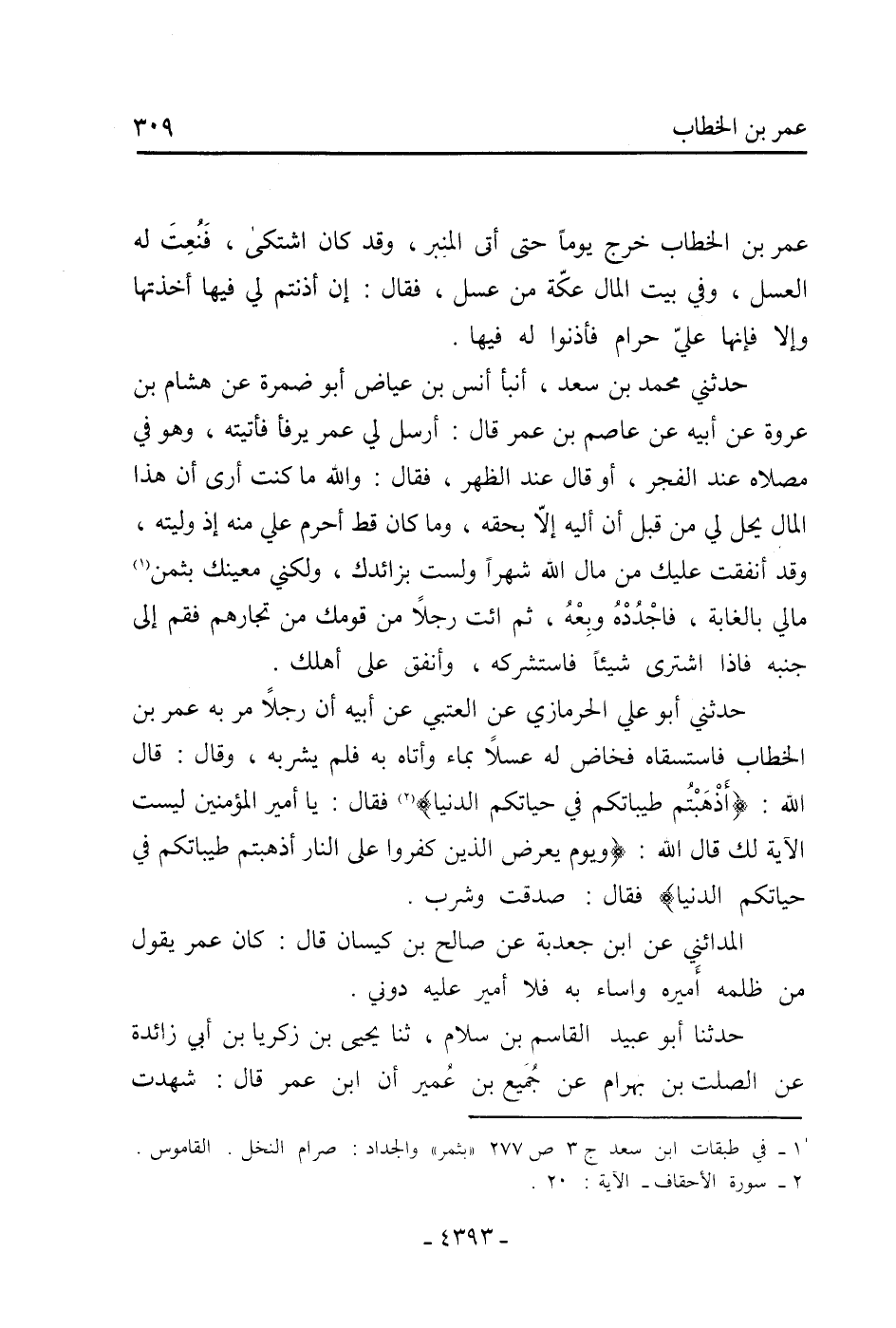 حَدَّثَنِي أَبُو عَلِيٍّ الْحِرْمَازِيُّ عَنِ الْعُتْبِيِّ عَنْ أَبِيهِ أَنَّ رَجُلا مَرَّ بِهِ عُمَرُ بْنُ الْخَطَّابِ فَاسْتَسْقَاهُ فَخَاضَ لَهُ عَسَلا بِمَاءٍ وَأَتَاهُ بِهِ فَلَمْ يَشْرَبْهُ، وَقَالَ: قَالَ الله: أذهبتم طيباتكم في حياتكم الدنيا [2] فَقَالَ: يَا أَمِيرَ الْمُؤْمِنِينَ لَيْسَتِ الآيَةُ لَكَ قَالَ اللَّهُ: وَيَوْمَ يُعْرَضُ الَّذِينَ كَفَرُوا عَلَى النار أذهبتم طيباتكم في حياتكم الدنيا فَقَالَ: صَدَقْتَ وَشَرِبَ.