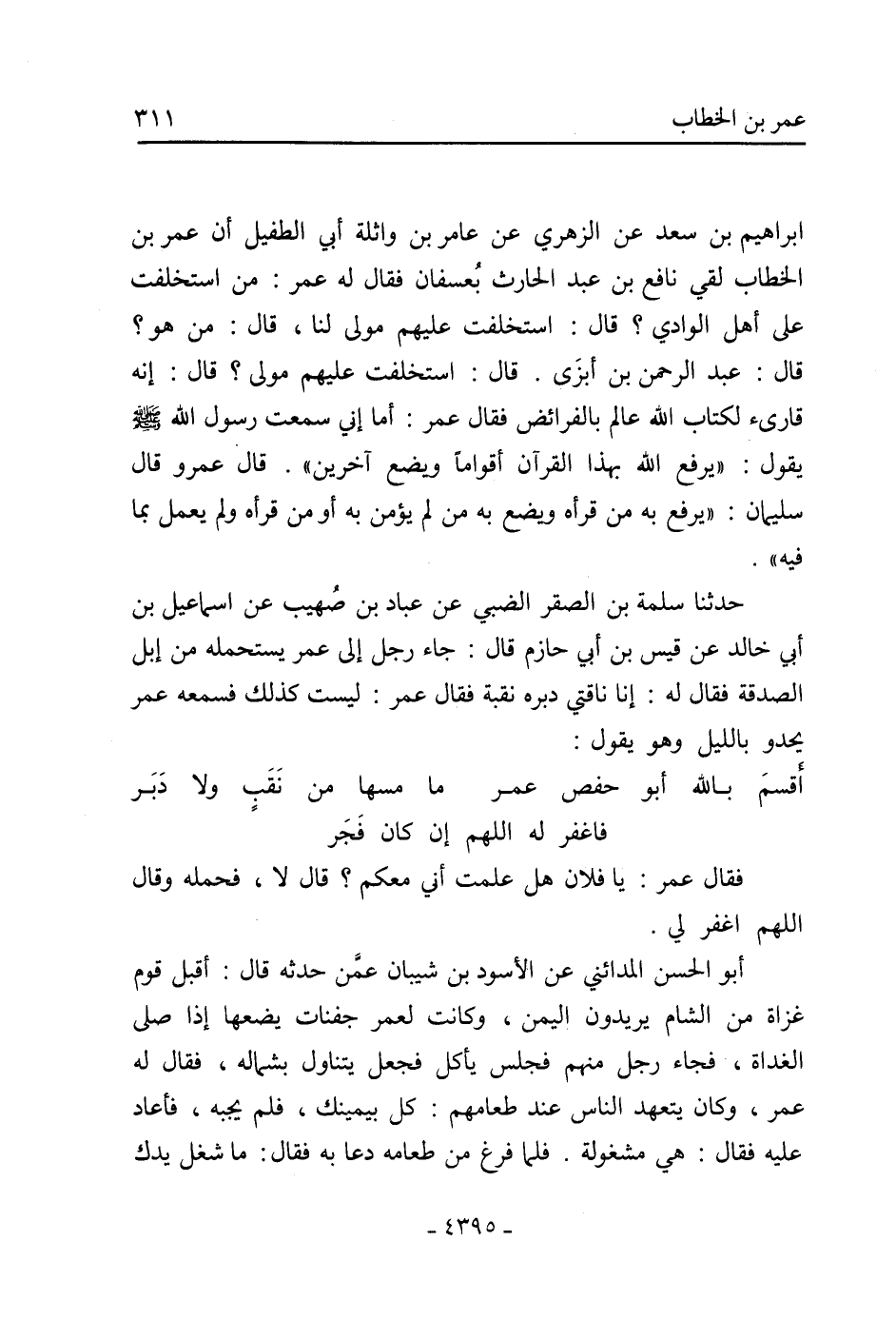 حَدَّثَنَا سَلَمَةُ بْنُ الصَّقْرِ الضَّبِّيُّ عَنْ عَبَّادِ بْنِ صُهَيْبٍ عَنْ إِسْمَاعِيلَ بْنِ أَبِي خَالِدٍ عَنْ قَيْسِ بْنِ أَبِي حَازِمٍ قَالَ: جَاءَ رَجُلٌ إِلَى عُمَرَ يَسْتَحْمِلُهُ مِنْ إِبِلِ الصَّدَقَةِ فَقَالَ لَهُ: أَنَا نَاقَتِي دَبِرَةٌ نَقِبَةٌ فَقَالَ عُمَرُ: لَيْسَتْ كَذَلِكَ فَسَمِعَهُ عُمَرُ يَحْدُو بِاللَّيْلِ وَهُوَ يَقُولُ: