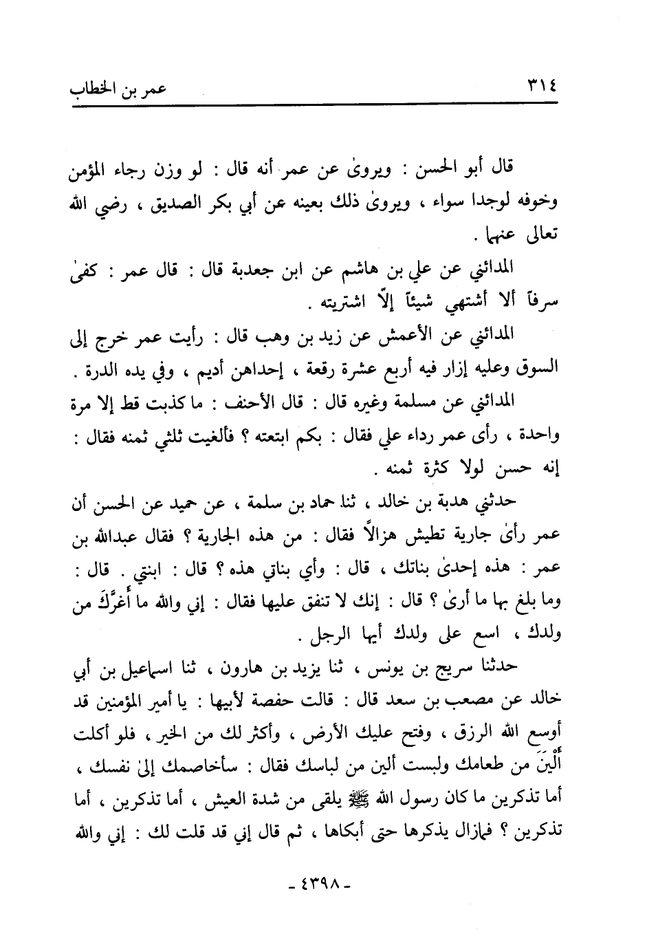 حَدَّثَنَا سُرَيْجُ بْنُ يُونُسَ، ثنا يَزِيدُ بْنُ هَارُونَ، ثنا إِسْمَاعِيلُ بْنُ أَبِي خَالِدٍ عَنْ مُصْعَبِ بْنِ سَعْدٍ قَالَ: قَالَتْ حَفْصَةُ لأَبِيهَا: يَا أَمِيرَ الْمُؤْمِنِينَ قَدْ أَوْسَعَ اللَّهُ الرِّزْقَ، وَفَتَحَ عَلَيْكَ الأَرْضَ، وَأَكْثَرَ لَكَ مِنَ الْخَيْرِ، فَلَوْ أَكَلْتَ أَلْيَنَ مِنْ طَعَامِكَ وَلَبِسْتَ أَلْيَنَ مِنْ لِبَاسِكَ فَقَالَ: سَأُخَاصِمُكَ إِلَى نَفْسِكَ، أَمَا تَذْكُرِينَ مَا كَانَ رَسُولُ اللَّهِ صَلَّى اللَّهُ عَلَيْهِ وَسَلَّمَ يَلْقَى مِنْ شِدَّةِ الْعَيْشِ، أَمَا تَذْكُرِينَ، أَمَا تَذْكُرِينَ؟ فَمَا زَالَ يَذْكُرُهَا حَتَّى أَبْكَاهَا، ثُمَّ قَالَ إِنِّي قَدْ قُلْتُ لَكَ: إِنِّي وَاللَّهِ