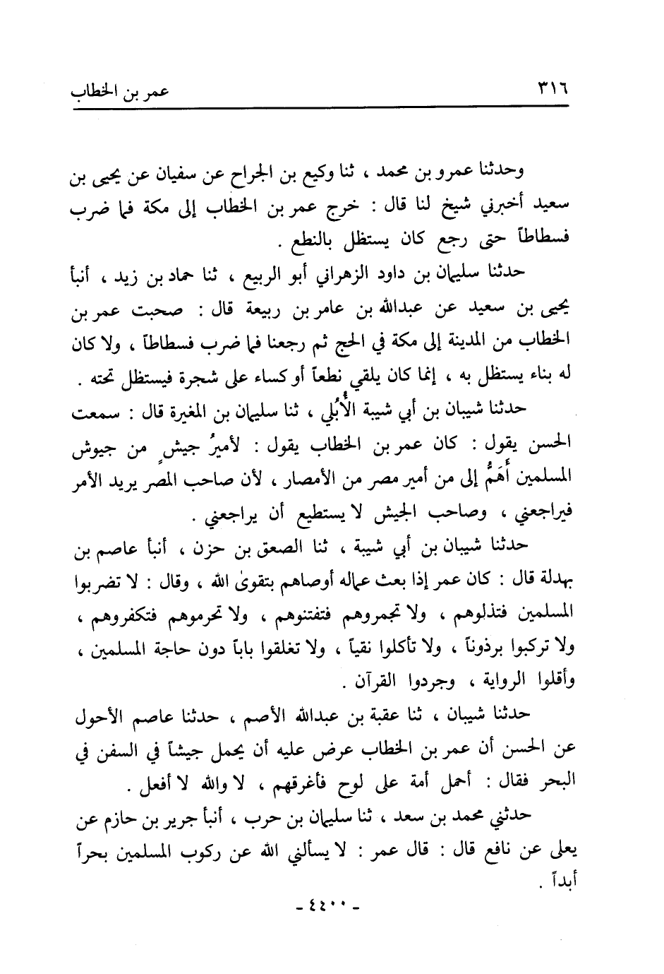 حَدَّثَنَا شَيْبَانُ بْنُ أَبِي شَيْبَةَ الأُبَلِّيُّ، ثنا سُلَيْمَانُ بْنُ الْمُغِيرَةِ قَالَ: سَمِعْتُ الْحَسَنَ يَقُولُ: كَانَ عُمَرُ بْنُ الْخَطَّابِ يَقُولُ: لأَمِيرُ جَيْشٍ مِنْ جُيُوشِ الْمُسْلِمِينَ أَهَمُّ إِلَيَّ مِنْ أَمِيرِ مِصْرٍ مِنَ الأَمْصَارِ، لأَنَّ صَاحِبَ الْمِصْرِ يُرِيدُ الأَمْرَ فَيُرَاجِعُنِي، وَصَاحِبُ الْجَيْشِ لا يَسْتَطِيعُ أَنْ يُرَاجِعُنِي.