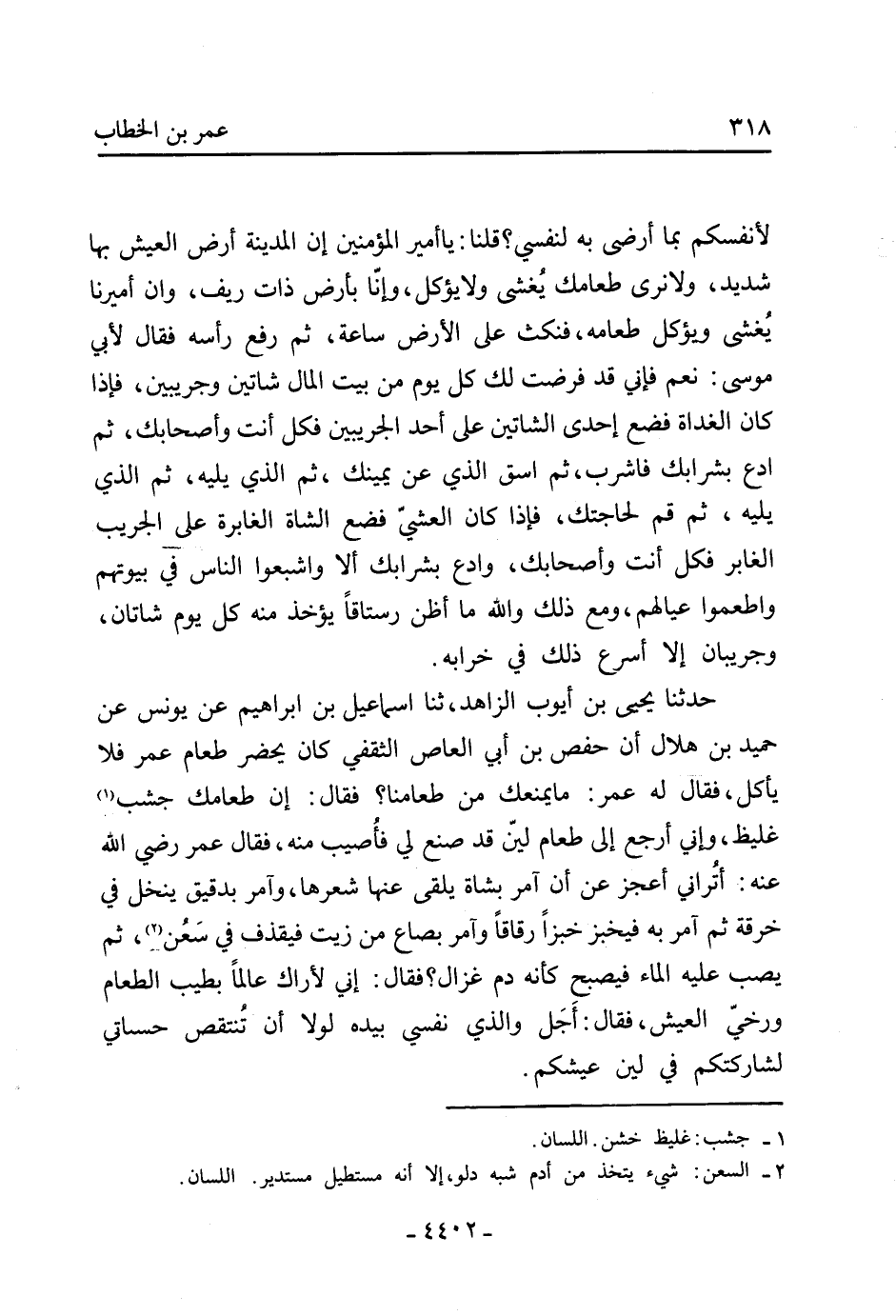 حَدَّثَنَا يَحْيَى بْنُ أَيُّوبَ الزَّاهِدُ، ثنا إِسْمَاعِيلُ بْنُ إِبْرَاهِيمَ عَنْ يُونُسَ عَنْ حُمَيْدِ بْنِ هِلالٍ أَنَّ حَفْصَ بْنَ أَبِي الْعَاصِ الثَّقَفِيَّ كَانَ يُحْضِرُ طَعَامَ عُمَرَ فَلا يَأْكُلُ، فَقَالَ لَهُ عُمَرُ: مَا يَمْنَعُكَ مِنْ طَعَامِنَا؟ فَقَالَ: إِنَّ طَعَامَكَ جَشِبٌ [1] غَلِيظٌ، وَإِنِّي أَرْجِعُ إِلَى طَعَامٍ لَيِّنٍ قَدْ صُنِعَ لِي فَأُصِيبُ مِنْهُ، فَقَالَ عُمَرُ رَضِيَ اللَّهُ عَنْهُ: أَتَرَانِي أَعْجَزُ عَنْ أَنْ آمُرُ بِشَاةٍ يُلْقَى عَنْهَا شَعْرُهَا، وَآمُرُ بِدَقِيقٍ يُنْخَلُ فِي خِرْقَةٍ ثُمَّ آمُرُ بِهِ فَيُخْبَزُ خُبْزًا رِقَاقًا وَآمُرُ بِصَاعٍ مِنْ زَيْتٍ فَيُقْذَفُ فِي سَعْنٍ [2] ، ثُمَّ يُصَبُّ عَلَيْهِ الْمَاءُ فَيُصْبِحُ كَأَنَّهُ دَمُ غَزَالٍ؟ فَقَالَ: إِنِّي لأَرَاكَ عَالِمًا بِطَيِّبِ الطَّعَامِ وَرَخِيِّ الْعَيْشِ، فَقَالَ: أَجَلْ وَالَّذِي نَفْسِي بِيَدِهِ لَوْلا أَنْ تنتقص حساتي لشاركتكم في لين عيشكم.