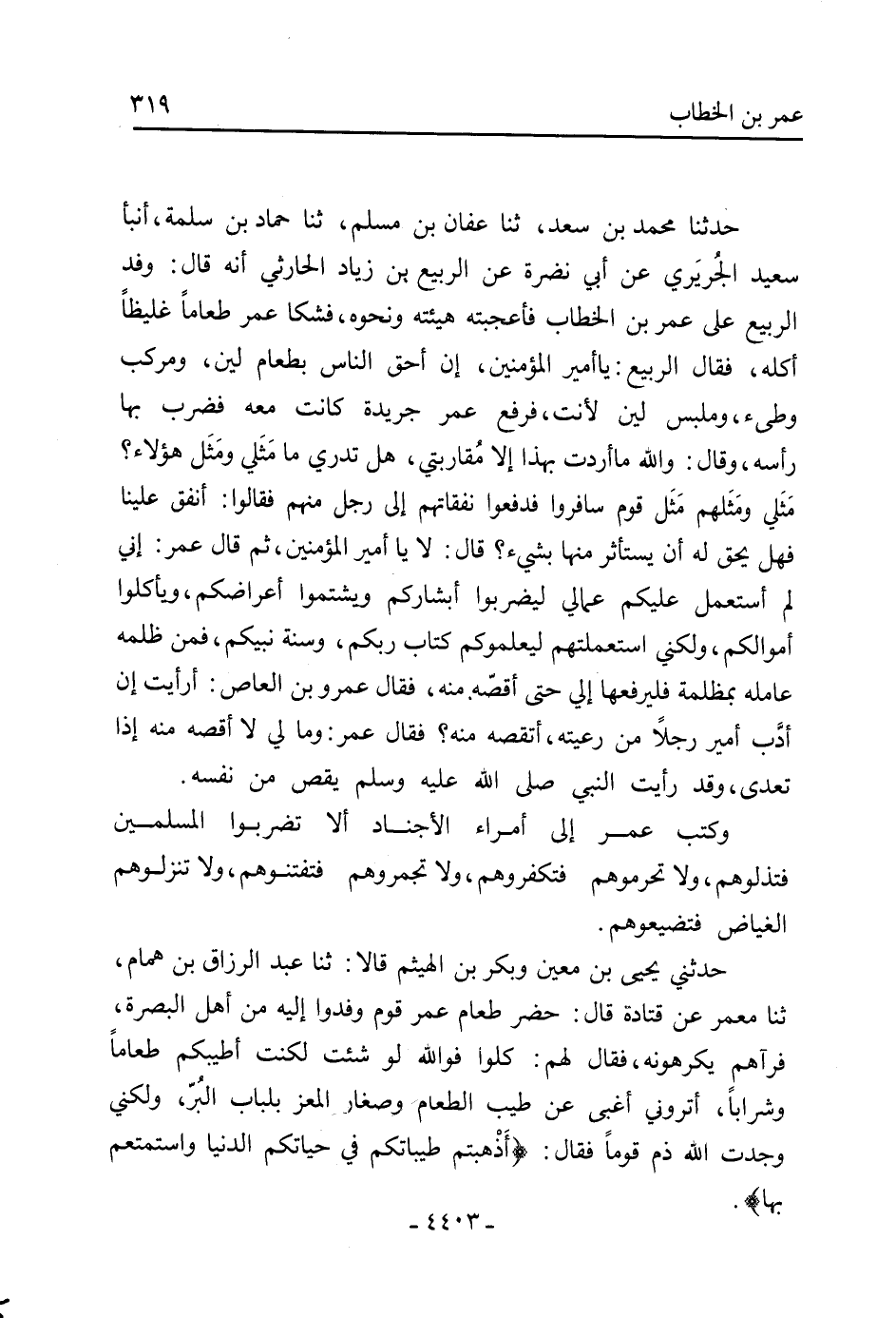 حَدَّثَنِي يَحْيَى بْنُ مَعِينٍ وَبَكْرُ بْنُ الْهَيْثَمِ قَالا: ثنا عَبْدُ الرَّزَّاقِ بن همام، ثنا معمر عن قَتَادَةَ قَالَ: حَضَرَ طَعَامَ عُمَرَ قَوْمٌ وَفَدُوا إِلَيْهِ مِنْ أَهْلِ الْبَصْرَةِ، فَرَآهُمْ يَكْرَهُونَهُ، فَقَالَ لهم: كلوا فو الله لَوْ شِئْتُ لَكُنْتُ أَطْيَبَكُمْ طَعَامًا وَشَرَابًا، أَتَرَوْنِي أَغْبَى عَنْ طَيِّبِ الطَّعَامِ وَصِغَارِ الْمَعْزِ بِلُبَابِ الْبُرِّ، وَلَكِنِّي وَجَدْتُ اللَّهَ ذَمَّ قَوْمًا فَقَالَ: أذهبتم طيباتكم في حياتكم الدنيا واستمتعم بها.