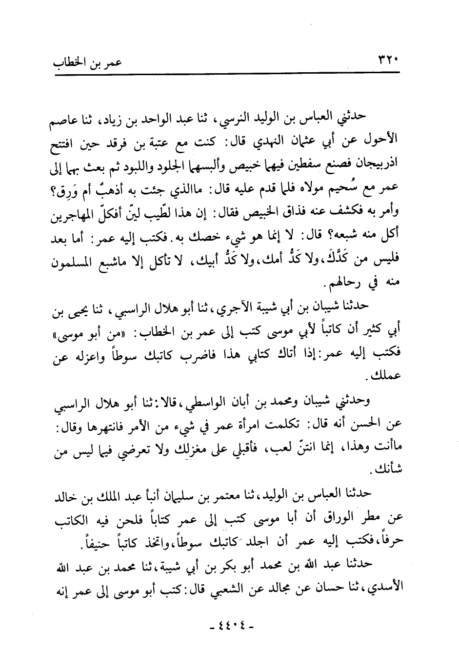 حَدَّثَنَا الْعَبَّاسُ بْنُ الْوَليِدِ، ثنا مُعْتَمِرُ بْنُ سُلَيْمَانَ أنبأ عَبْدُ الْمَلِكِ بْنُ خَالِدٍ عَنْ مَطَرٍ الْوَرَّاقِ أَنَّ أَبَا مُوسَى كَتَبَ إِلَى عُمَرَ كِتَابًا فَلَحَنَ فِيهِ الْكَاتِبُ حَرْفًا، فَكَتَبَ إِلَيْهِ عُمَرُ أَنِ اجْلِدْ كَاتِبَكَ سوطا، واتخذ كاتبا حنيفا.