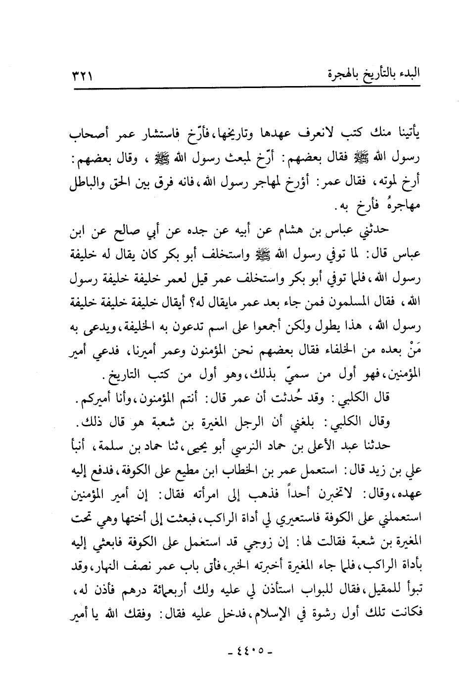 حَدَّثَنِي عَبَّاسُ بْنُ هِشَامٍ عَنْ أَبِيهِ عَنْ جَدِّهِ عَنْ أَبِي صَالِحٍ عَنِ ابْنِ عَبَّاسٍ قَالَ: لَمَّا تُوُفِّيَ رَسُولُ اللَّهِ صَلَّى اللَّهُ عَلَيْهِ وَسَلَّمَ وَاسْتُخْلِفَ أَبُو بَكْرٍ كَانَ يُقَالُ لَهُ خَلِيفَةَ رَسُولِ اللَّهِ، فَلَمَّا تُوُفِّيَ أَبُو بَكْرٍ وَاسْتُخْلِفَ عُمَرُ قِيلَ لِعُمَرَ خَلِيفَةُ خَلِيفَةِ رَسُولِ اللَّهِ، فَقَالَ الْمُسْلِمُونَ فَمَنْ جَاءَ بَعْدَ عُمَرَ مَا يُقَالُ لَهُ؟ أَيُقَالُ خَلِيفَةُ خَلِيفَةِ خَلِيفَةِ رَسُولِ اللَّهِ، هَذَا يَطُولُ وَلَكِنْ أَجْمِعُوا عَلَى اسْمٍ تَدْعُونَ بِهِ الْخَلِيفَةَ، وَيُدْعَى بِهِ مَنْ بَعْدَهُ مِنَ الْخُلَفَاءِ فَقَالَ بَعْضُهُمْ نَحْنُ الْمُؤْمِنُونَ وَعُمَرُ أَمِيرُنَا، فَدُعِيَ أَمِيرَ الْمُؤْمِنِينَ، فَهُوَ أَوَّلُ مَنْ سُمِّيَ بِذَلِكَ، وَهُوَ أَوَّلُ مَنْ كَتَبَ التَّارِيخَ.