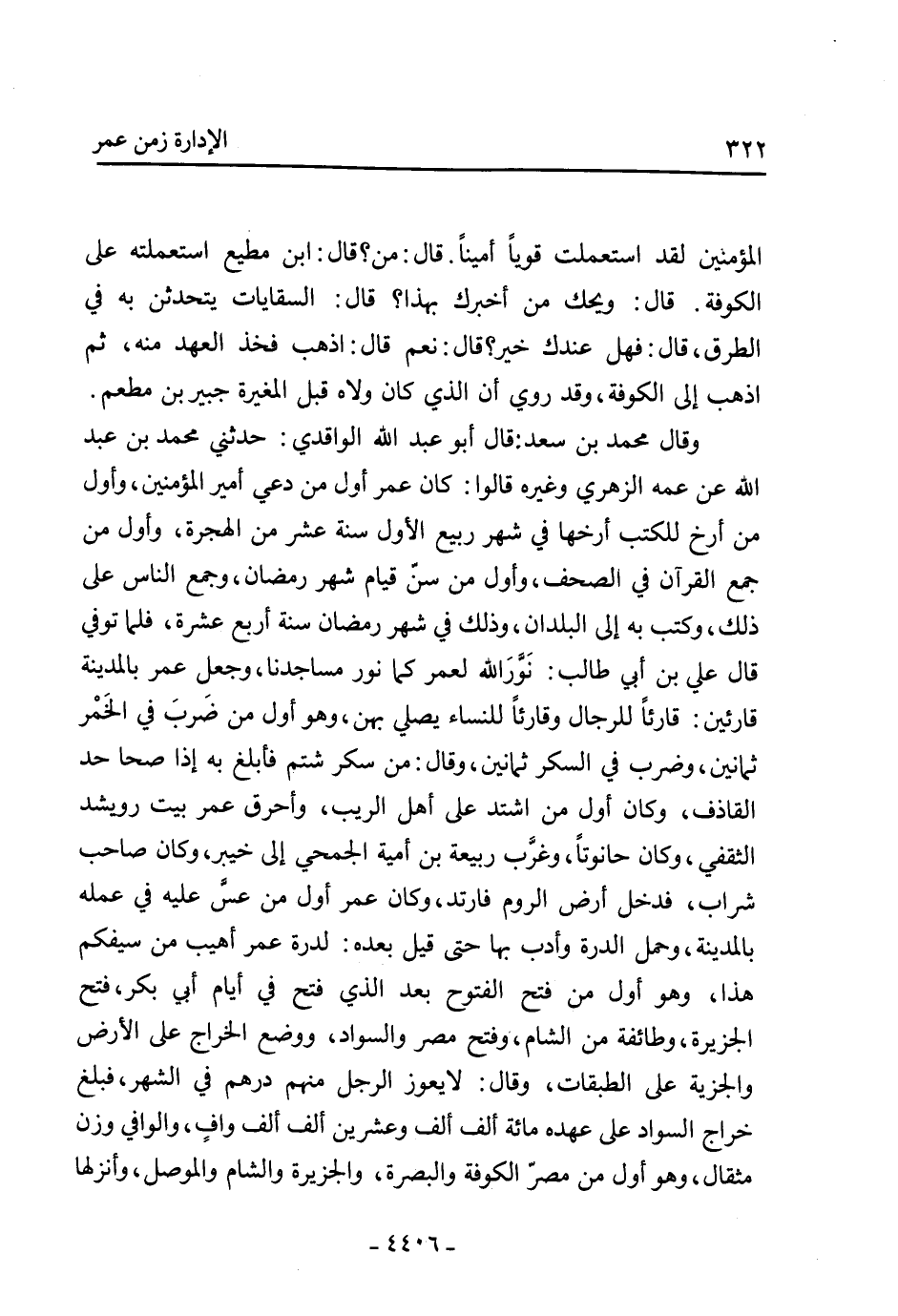 وَقَالَ مُحَمَّدُ بْنُ سَعْدٍ: قَالَ أَبُو عَبْدِ اللَّهِ الْوَاقِدِيِّ: حَدَّثَنِي مُحَمَّدُ بْنُ عَبْدِ اللَّهِ عَنِ عمه الزهري وغيره قَالُوا: كَانَ عُمَرُ أَوَّلَ مَنْ دُعِيَ أَمِيرَ الْمُؤْمِنِينَ، وَأَوَّلَ مَنْ أَرَّخَ لِلْكُتُبِ أَرَّخَهَا فِي شَهْرِ رَبِيعٍ الأَوَّلِ سَنَةَ عَشْرٍ مِنَ الْهِجْرَةِ، وَأَوَّلَ مَنْ جَمَعَ الْقُرْآنَ فِي الصُّحُفِ، وَأَوَّلَ مَنْ سَنَّ قِيَامَ شَهْرِ رَمَضَانَ، وَجَمَعَ النَّاسَ عَلَى ذَلِكَ، وَكَتَبَ بِهِ إِلَى الْبُلْدَانِ، وَذَلِكَ فِي شَهْرِ رَمَضَانَ سَنَةَ أَرْبَعَ عَشْرَةَ، فَلَمَّا تُوُفِّيَ قَالَ عَلِيُّ بْنُ أَبِي طَالِبٍ: نُورُ اللَّهِ لِعُمَرَ كَمَا نُورُ مَسَاجِدِنَا، وَجَعَلَ عُمَرُ بِالْمَدِينَةِ قَارِئَيْنِ: قَارِئًا لِلرِّجَالِ وَقَارِئًا لِلنِّسَاءِ يُصَلِّي بِهِنَّ، وَهُوَ أَوَّلُ مَنْ ضَرَبَ فِي الْخَمْرِ ثَمَانِينَ، وَضَرَبَ فِي السُّكْرِ ثَمَانِينَ، وَقَالَ: مَنْ سَكِرَ شَتَمَ فَأَبْلَغَ بِهِ إِذَا صَحَا حَدَّ الْقَاذِفِ، وَكَانَ أَوَّلُ مَنِ اشْتَدَّ عَلَى أَهْلِ الرِّيَبِ، وَأَحْرَقَ عُمَرُ بَيْتَ رُوَيْشِدٍ الثَّقَفِيِّ، وَكَانَ حَانُوتًا، وَغَرَّبَ رَبِيعَةَ بْنَ أُمَيَّةَ الْجُمَحِيَّ إِلَى خَيْبَرَ، وَكَانَ صَاحِبَ شَرَابٍ، فَدَخَلَ أَرْضَ الرُّومِ فَارْتَدَّ، وَكَانَ عُمَرُ أَوَّلَ مَنْ عَسَّ عَلَيْهِ فِي عَمَلِهِ بِالْمَدِينَةِ، وَحَمَلَ الدَّرَّةَ وَأَدَّبَ بِهَا حَتَّى قِيلَ بَعْدَهُ: لَدِرَّةُ عُمَرَ أَهْيَبُ مِنْ سَيْفِكُمْ هَذَا، وَهُوَ أَوَّلُ مَنْ فَتَحَ الْفُتُوحَ، بَعْدَ الَّذِي فُتِحَ فِي أَيَّامِ أَبِي بَكْرٍ، فَتَحَ الْجَزِيرَةَ، وَطَائِفَةً مِنَ الشَّامِ، وَفَتَحَ مِصْرَ وَالسَّوَادَ، وَوَضَعَ الْخَرَاجَ عَلَى الأَرْضِ وَالْجِزْيَةَ عَلَى الطَّبَقَاتِ، وَقَالَ: لا يَعُوزُ الرَّجُلُ مِنْهُمْ دِرْهَمٌ فِي الشَّهْرِ، فَبَلَغَ خَرَاجُ السَّوَادِ عَلَى عَهْدِهِ مِائَةَ أَلْفِ أَلْفٍ وَعِشْرِينَ أَلْفِ أَلْفِ وَافٍ، وَالْوَافِي وَزْنُ مِثْقَالٍ، وَهُوَ أَوَّلُ مَنْ مَصَّرَ الْكُوفَةَ وَالْبَصْرَةَ، وَالْجَزِيرَةَ، وَالشَّامَ وَالْمَوْصِلَ، وَأَنْزَلَهَا