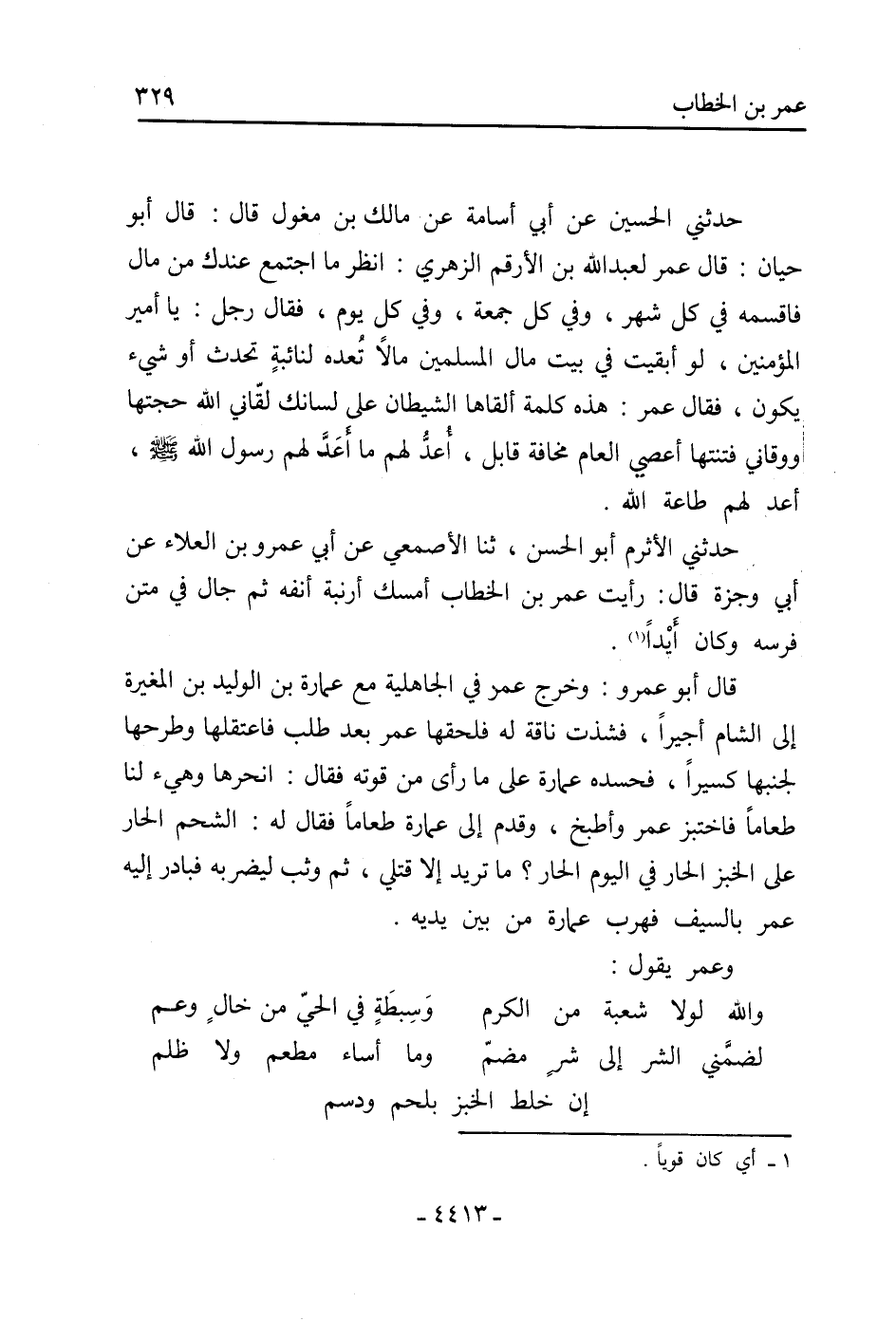 حَدَّثَنِي الأَثْرَمُ أَبُو الْحَسَنِ، ثنا الأَصْمَعِيُّ عَنْ أَبِي عَمْرِو بْنِ الْعَلاءِ عَنْ أَبِي وَجْزَةَ قَالَ: رَأَيْتُ عُمَرَ بْنَ الْخَطَّابِ أَمْسَكَ أَرْنَبَةَ أَنْفِهِ ثُمَّ جَالَ فِي مَتْنِ فَرَسِهِ وَكَانَ أَيْدًا [1] .