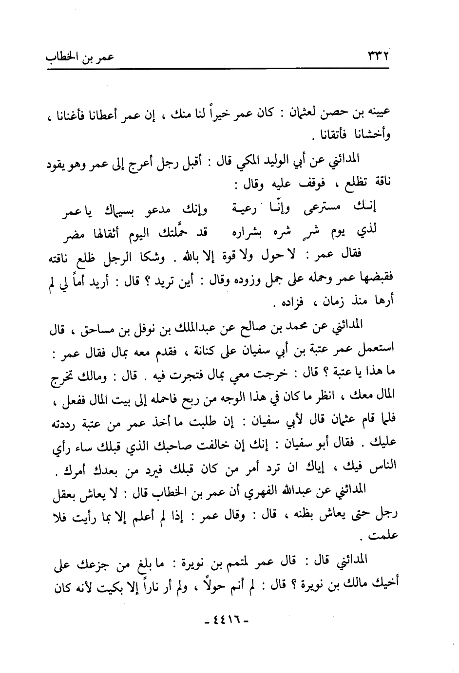 الْمَدَائِنِيُّ قَالَ: قَالَ عُمَرُ لِمُتَمِّمِ بْنِ نُوَيْرَةَ: مَا بلغ من جزعك على أخيك مالك بن نُوَيْرَةَ؟ قَالَ: لَمْ أَنَمْ حَوْلا، وَلَمْ أَرَ نَارًا إِلا بَكَيْتُ لأَنَّهُ كَانَ
