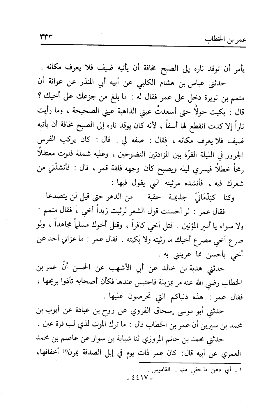 قَالَ: بَكَيْتُ حَوْلا حَتَّى أَسْعَدَتْ عَيْنِي الذَّاهِبَةُ عَيْنِي الصَّحِيحَةَ، وَمَا رَأَيْتُ نَارًا إِلا كِدْتُ أَنْقَطِعُ لَهَا أَسَفًا، لأَنَّهُ كَانَ يُوقِدُ نَارَهُ إِلَى الصُّبْحِ مَخَافَةَ أَنْ يَأْتِيَهُ ضَيْفٌ فَلا يَعْرِفُ مَكَانَهُ، فَقَالَ: صِفْهُ لِي. قَالَ: كَانَ يَرْكَبُ الْفَرَسَ الْجَرُورَ فِي اللَّيْلَةِ الْقَرَّةِ بَيْنَ الْمَزَادَتَيْنِ النَّضُوحَيْنِ، وَعَلَيْهِ شَمْلَةٌ فَلُوتٌ مُعْتَقِلا رُمْحًا خَطْلا فَيَسْرِي لَيْلَهُ وَيُصْبِحُ كَأَنَّ وَجْهَهُ فَلْقَةُ قَمَرٍ، قَالَ: فَأَنْشَدَنِي مِنْ شِعْرِكَ فِيهِ، فَأَنْشَدَهُ مَرْثِيَتَهُ الَّتِي يَقُولُ فِيهَا: