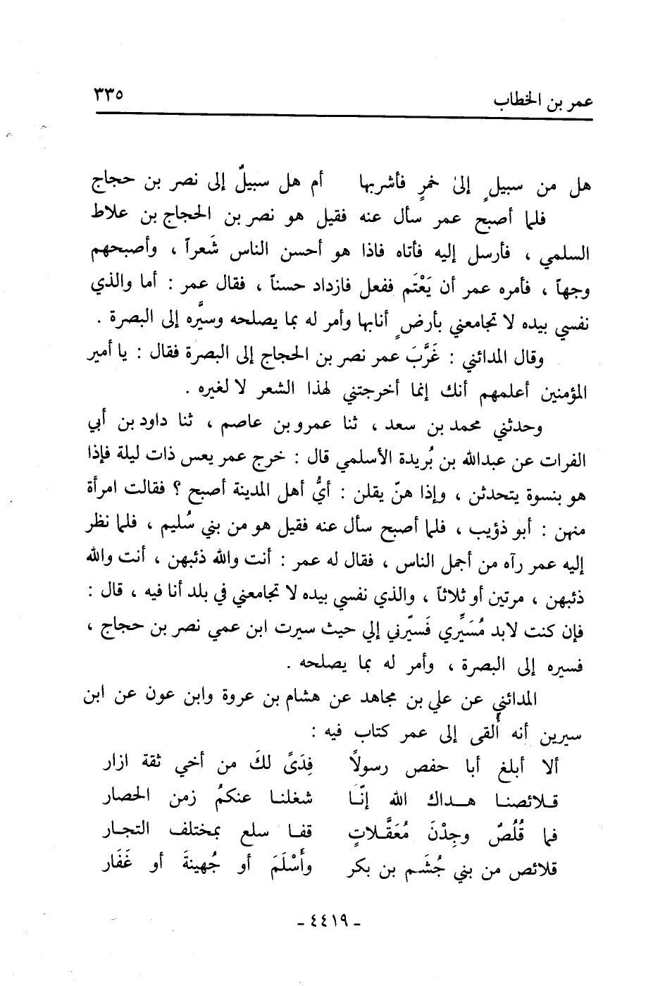 هل من سبيل إلى خمر فأشربها ... أم هَلْ سَبِيلٌ إِلَى نَصْرِ بْنِ حَجَّاجِ