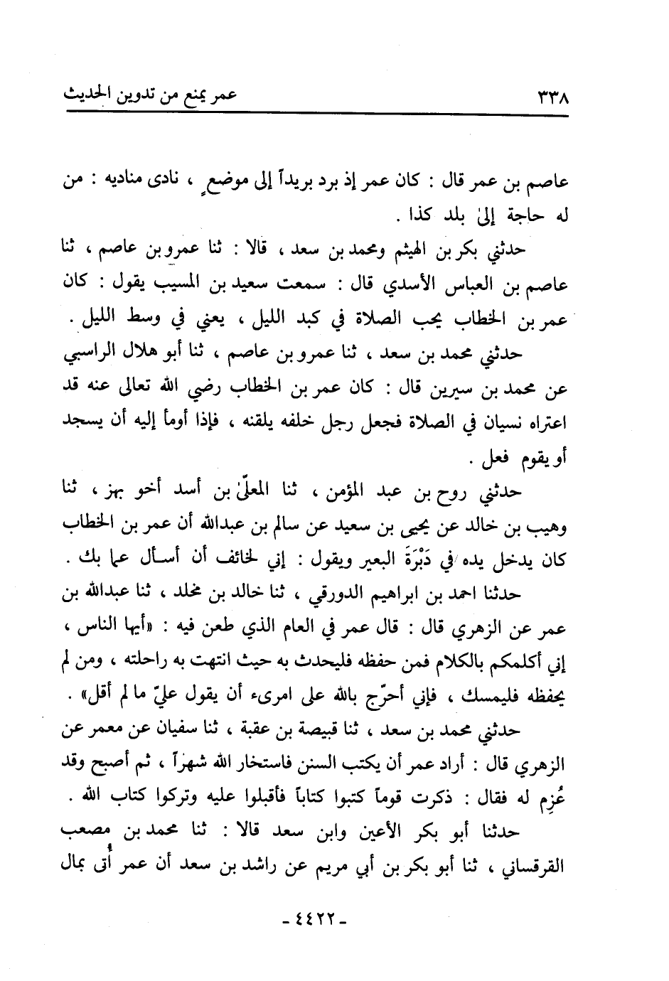 حَدَّثَنِي مُحَمَّدُ بْنُ سَعْدٍ، ثنا قَبِيصَةُ بْنُ عُقْبَةَ، ثنا سُفْيَانُ عَنْ مَعْمَرٍ عَنِ الزُّهْرِيِّ قَالَ: أَرَادَ عُمَرُ أَنْ يَكْتُبَ السُّنَنَ فَاسْتَخَارَ اللَّهَ شَهْرًا، ثُمَّ أَصْبَحَ وَقَدْ عَزَمَ لَهُ فَقَالَ: ذَكَرْتُ قَوْمًا كَتَبُوا كِتَابًا فَأَقْبَلُوا عَلَيْهِ وَتَرَكُوا كِتَابَ اللَّهِ.