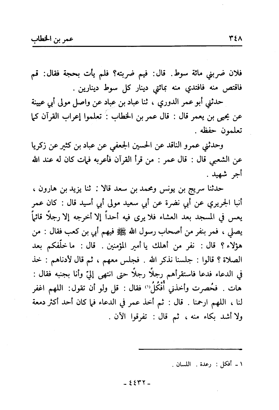 حَدَّثَنِي أبو عمر الدوري، ثنا عباد بن عَبَّادٌ عَنْ وَاصِلٍ مَوْلَى أَبِي عُيَيْنَةَ عَنْ يَحْيَى بْنِ يَعْمُرَ قَالَ: قَالَ عُمَرُ بْنُ الْخَطَّابِ: تَعَلَّمُوا إِعْرَابَ الْقُرْآنِ كَمَا تُعَلَّمُونَ حِفْظَهُ.