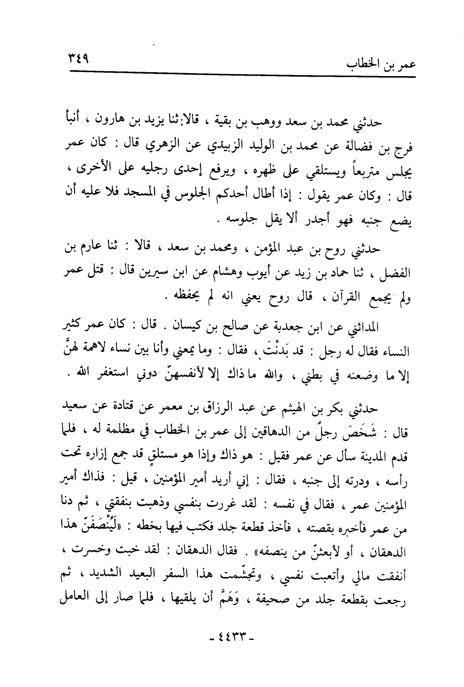 حَدَّثَنِي مُحَمَّدُ بْنُ سَعْدٍ وَوَهْبُ بْنُ بَقِيَّةَ، قَالا: ثنا يَزِيدُ بْنُ هَارُونَ، أنبأ فَرَجُ بْنُ فَضَالَةَ عَنْ مُحَمَّدِ بْنِ الْوَليِدِ الزُّبَيْدِيِّ عَنِ الزُّهْرِيِّ قَالَ: كَانَ عُمَرُ يَجْلِسُ مُتَرَبِّعًا وَيَسْتَلْقِي عَلَى ظَهْرِهِ، وَيَرْفَعُ إِحْدَى رِجْلَيْهِ عَلَى الأُخْرَى، قَالَ: وَكَانَ عُمَرُ يَقُولُ: إِذَا أَطَالَ أَحَدُكُمُ الْجُلُوسَ فِي الْمَسْجِدِ فَلا عَلَيْهِ أَنْ يَضَعَ جَنْبَهُ فَهُوَ أَجْدَرُ أَلا يَقِلَّ جُلُوسُهُ.