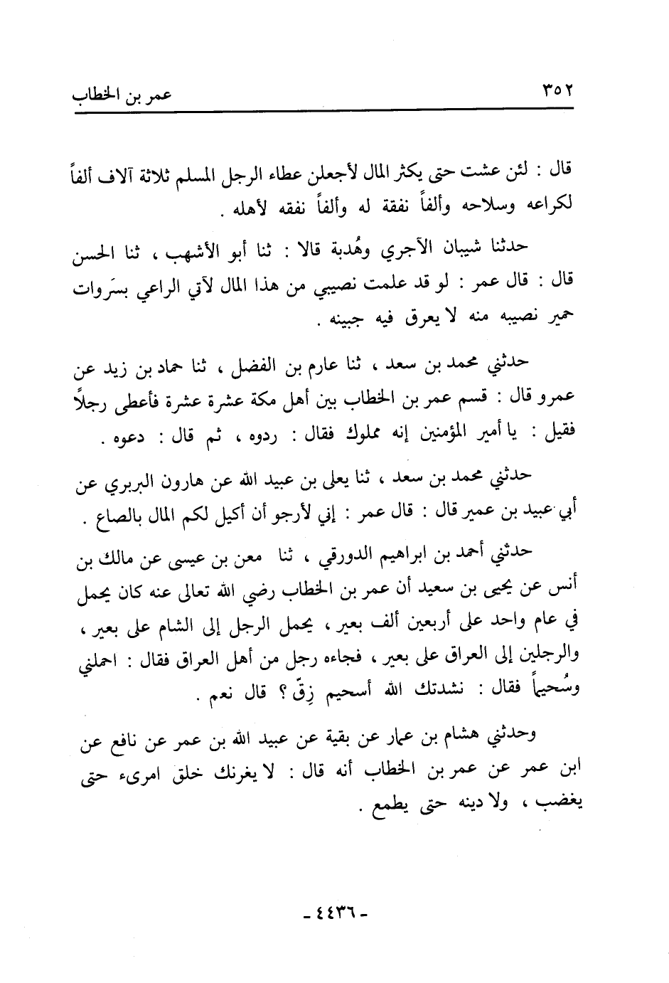 حَدَّثَنَا شَيْبَانُ الآجُرِّيُّ وَهُدْبَةُ قَالا: ثنا أَبُو الأَشْهَبِ، ثنا الْحَسَنُ قَالَ: قَالَ عُمَرُ: لَوْ قَدْ عَلِمْتُ نَصِيبِي مِنْ هَذَا الْمَالِ لآتِي الرَّاعِي بِسَرَوَاتِ حَمِيرٍ نُصِيبُهُ مِنْهُ لا يَعْرَقُ فِيهِ جَبِينُهُ.
