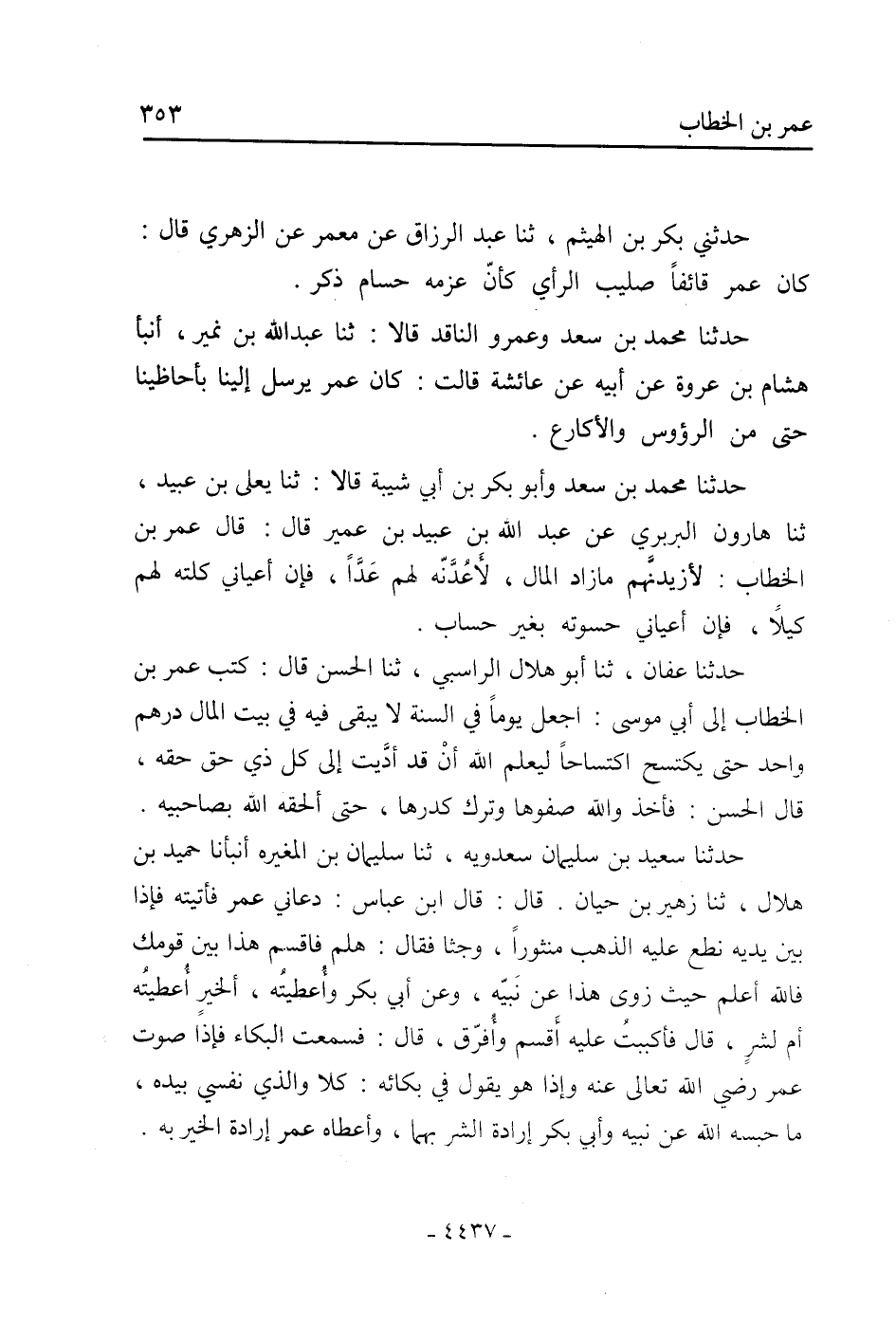 حَدَّثَنَا سَعِيدُ بْنُ سُلَيْمَانَ سَعْدَوَيْهِ، ثنا سُلَيْمَانُ بْنُ الْمُغِيرَةِ أَنْبَأَنَا حُمَيْدُ بْنُ هِلالٍ، ثنا زُهَيْرُ بْنُ حَيَّانَ. قَالَ: قَالَ ابْنُ عَبَّاسٍ: دَعَانِي عُمَرُ فَأَتَيْتُهُ فَإِذَا بَيْنَ يَدَيْهِ نِطْعٌ عَلَيْهِ الذَّهَبُ مَنْثُورًا، وَجَثَا فَقَالَ: هَلُمَّ فَاقْسِمْ هذا بين قومك فالله أعلم حيث زوى هَذَا عَنْ نَبِيِّهِ، وَعَنْ أَبِي بَكْرٍ وَأَعْطَيْتُهُ، أَلِخَيْرٍ أَعْطَيْتَهُ أَمْ لِشَرٍّ، قَالَ فَأَكْبَبْتُ عَلَيْهِ أَقْسِمُ وَأُفَرِّقُ، قَالَ: فَسَمِعْتُ الْبُكَاءَ فَإِذَا صَوْتُ عُمَرَ رَضِيَ اللَّهُ تَعَالَى عَنْهُ وَإِذَا هُوَ يَقُولُ فِي بُكَائِهِ: كَلا وَالَّذِي نَفْسِي بِيَدِهِ، مَا حَبَسَهُ اللَّهُ عَنْ نَبِيِّهِ وأَبِي بَكْرٍ إِرَادَةَ الشَّرِّ بِهِمَا، وَأَعْطَاهُ عُمَرَ إِرَادَةَ الْخَيْرِ به.