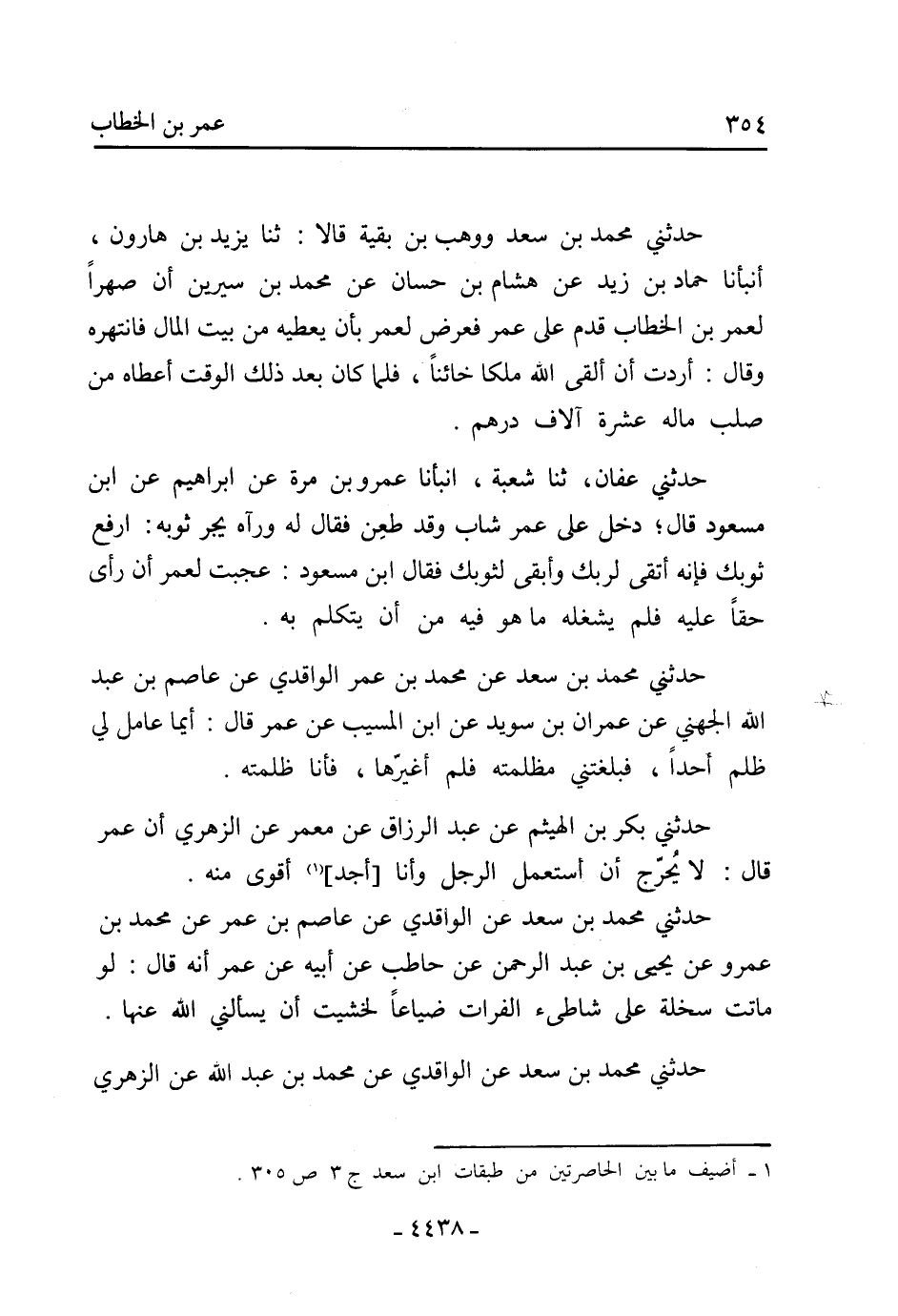 حَدَّثَنِي مُحَمَّدُ بْنُ سَعْدٍ عَنِ الْوَاقِدِيِّ عن عَاصِمِ بْنِ عُمَرَ عَنْ مُحَمَّدُ بْنُ عَمْرٍو عَنْ يَحْيَى بْنِ عَبْدِ الرَّحْمَنِ عَنْ حَاطِبٍ عَنْ أَبِيهِ عَنْ عُمَرَ أَنَّهُ قَالَ: لَوْ مَاتَتْ سَخْلَةٌ عَلَى شَاطِئِ الْفُرَاتِ ضَيَاعًا لَخَشِيتُ أَنْ يَسْأَلَنِي اللَّهُ عَنْهَا.