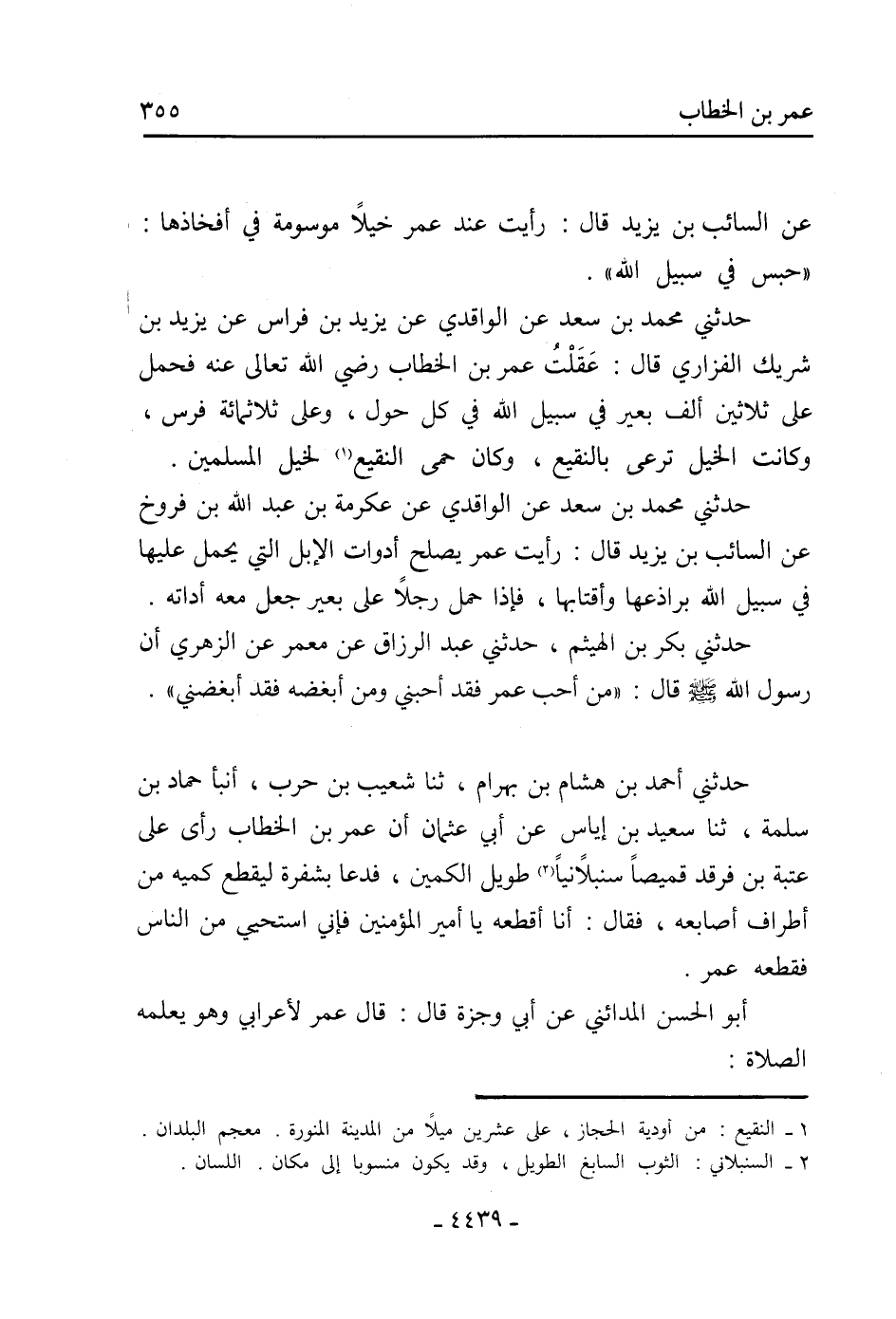حَدَّثَنِي مُحَمَّدُ بْنُ سَعْدٍ عَنِ الْوَاقِدِيِّ عَنْ يَزِيدَ بْنِ فِرَاسٍ عَنْ يَزِيدَ بْنِ شَرِيكٍ الْفَزَارِيِّ قَالَ: عَقِلْتُ عُمَرَ بن الخطاب رضي الله تعالى عنه فحمل عَلَى ثَلاثِينَ أَلْفِ بَعِيرٍ فِي سَبِيلِ اللَّهِ في كل حول، وعلى ثلاثمائة فَرَسٍ، وَكَانَتِ الْخَيْلُ تَرْعَى بِالنَّقِيعِ، وَكَانَ حَمَى النَّقِيعَ [1] لِخَيْلِ الْمُسْلِمِينَ.