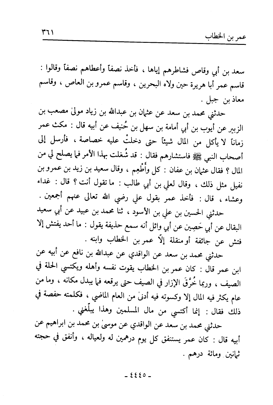 حَدَّثَنِي مُحَمَّدُ بْنُ سَعْدٍ عَنْ عُثْمَانَ بْنِ عَبْدِ اللَّهِ بْنِ زِيَادٍ مَوْلَى مُصْعَبِ بْنِ الزُّبَيْرِ عَنْ أَيُّوبَ بْنِ أَبِي أُمَامَةَ بْنِ سَهْلِ بْنِ حَنِيفٍ عَنْ أَبِيهِ قَالَ: مَكَثَ عُمَرُ زَمَانًا لا يَأْكُلُ مِنَ الْمَالِ شَيْئًا حَتَّى دَخَلَتْ عَلَيْهِ خَصَاصَةٌ، فَأَرْسَلَ إِلَى أَصْحَابِ النَّبِيِّ صَلَّى اللَّهُ عَلَيْهِ وَسَلَّمَ فَاسْتَشَارَهُمْ فَقَالَ: قَدْ شُغِلْتُ بِهَذَا الأَمْرِ فَمَا يَصْلُحُ لِي مِنَ الْمَالِ؟ فَقَالَ عُثْمَانُ بْنُ عَفَّانَ: كُلْ وَأَطْعِمْ، وَقَالَ سَعِيد بْن زَيْد بْن عَمْرِو بْنِ نفيل مِثْلَ ذَلِكَ، وَقَالَ لِعَلِيِّ بْنِ أَبِي طَالِبٍ: مَا تَقُولُ أَنْتَ؟ قَالَ: غَدَاءٌ وَعَشَاءٌ، قَالَ: فَأَخَذَ عُمَرُ بِقَوْلِ عَلِيٍّ رَضِيَ اللَّهُ تَعَالَى عَنْهُمْ أَجْمَعِينَ.