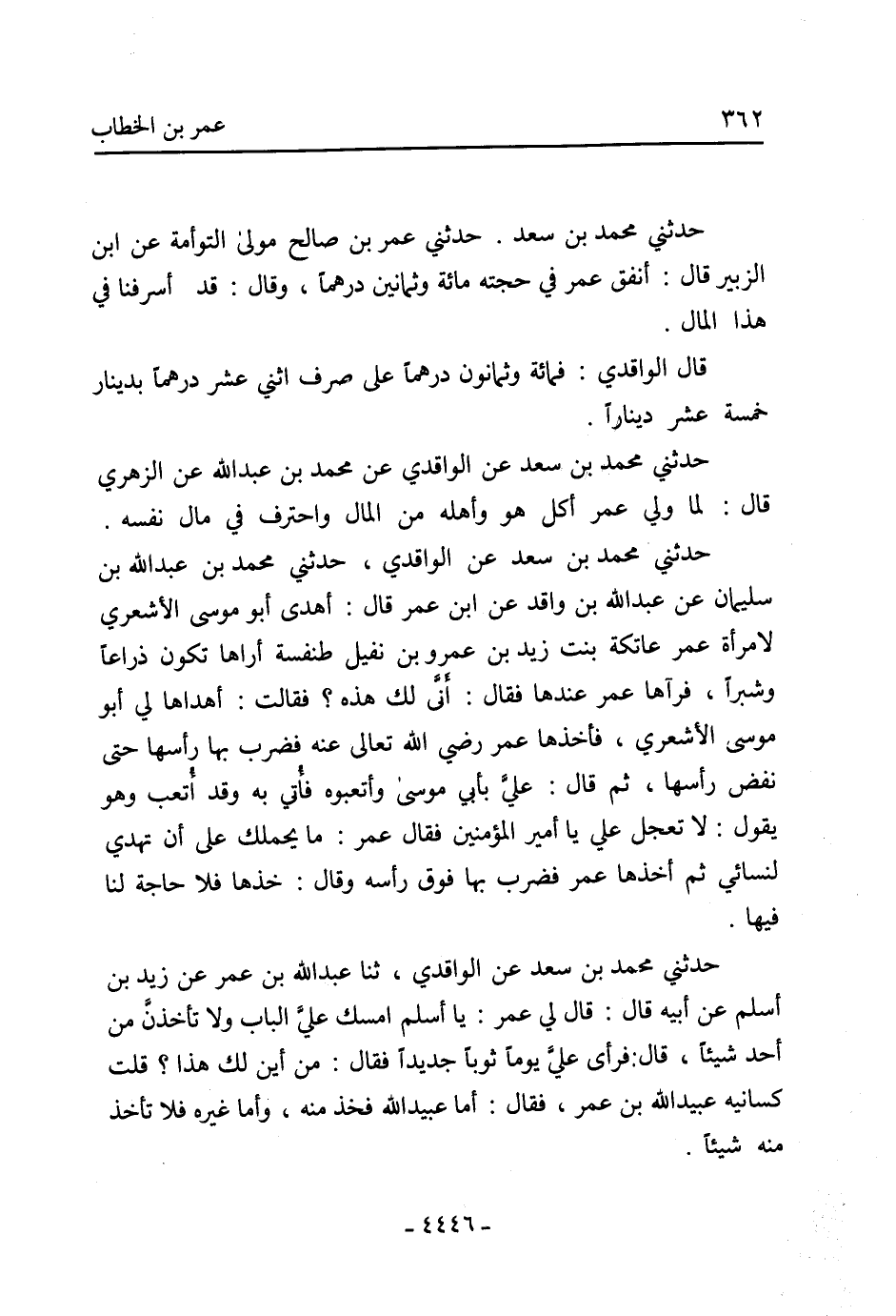 حَدَّثَنِي مُحَمَّدُ بْنُ سَعْدٍ عَنِ الْوَاقِدِيِّ، حَدَّثَنِي مُحَمَّدُ بْنُ عَبْدِ اللَّهِ بْنِ سُلَيْمَانَ عَنْ عَبْدِ اللَّهِ بْنِ وَاقِدٍ عَنِ ابْنِ عُمَرَ قَالَ: أَهْدَى أَبُو مُوسَى الأَشْعَرِيُّ لامْرَأَةِ عُمَرَ عَاتِكَةَ بِنْتِ زَيْدِ بْن عَمْرو بْن نُفَيْلٍ طِنْفِسَةً أَرَاهَا تَكُونُ ذِرَاعًا وَشِبْرًا، فَرَآهَا عُمَرُ عِنْدَهَا فَقَالَ: أَنَّى لَكِ هَذِهِ؟ فَقَالَتْ: أَهْدَاهَا لِي أَبُو مُوسَى الأَشْعَرِيُّ، فَأَخَذَهَا عُمَرُ رَضِيَ اللَّهُ تَعَالَى عَنْهُ فَضَرَبَ بِهَا رَأْسَهَا حَتَّى نَفَضَ رَأْسَهَا، ثُمَّ قَالَ: عَلَيَّ بِأَبِي مُوسَى وَأَتْعَبُوهُ فَأُتِيَ بِهِ وَقَدْ أُتْعِبَ وَهُوَ يَقُولُ: لا تَعْجَلْ عَلَيَّ يَا أَمِيرَ الْمُؤْمِنِينَ فَقَالَ عُمَرُ: مَا يَحْمِلُكَ عَلَى أَنْ تُهْدِي لِنِسَائِي ثُمَّ أَخَذَهَا عُمَرُ فَضَرَبَ بِهَا فَوْقَ رَأْسِهِ وَقَالَ: خُذْهَا فَلا حَاجَةَ لَنَا فِيهَا.