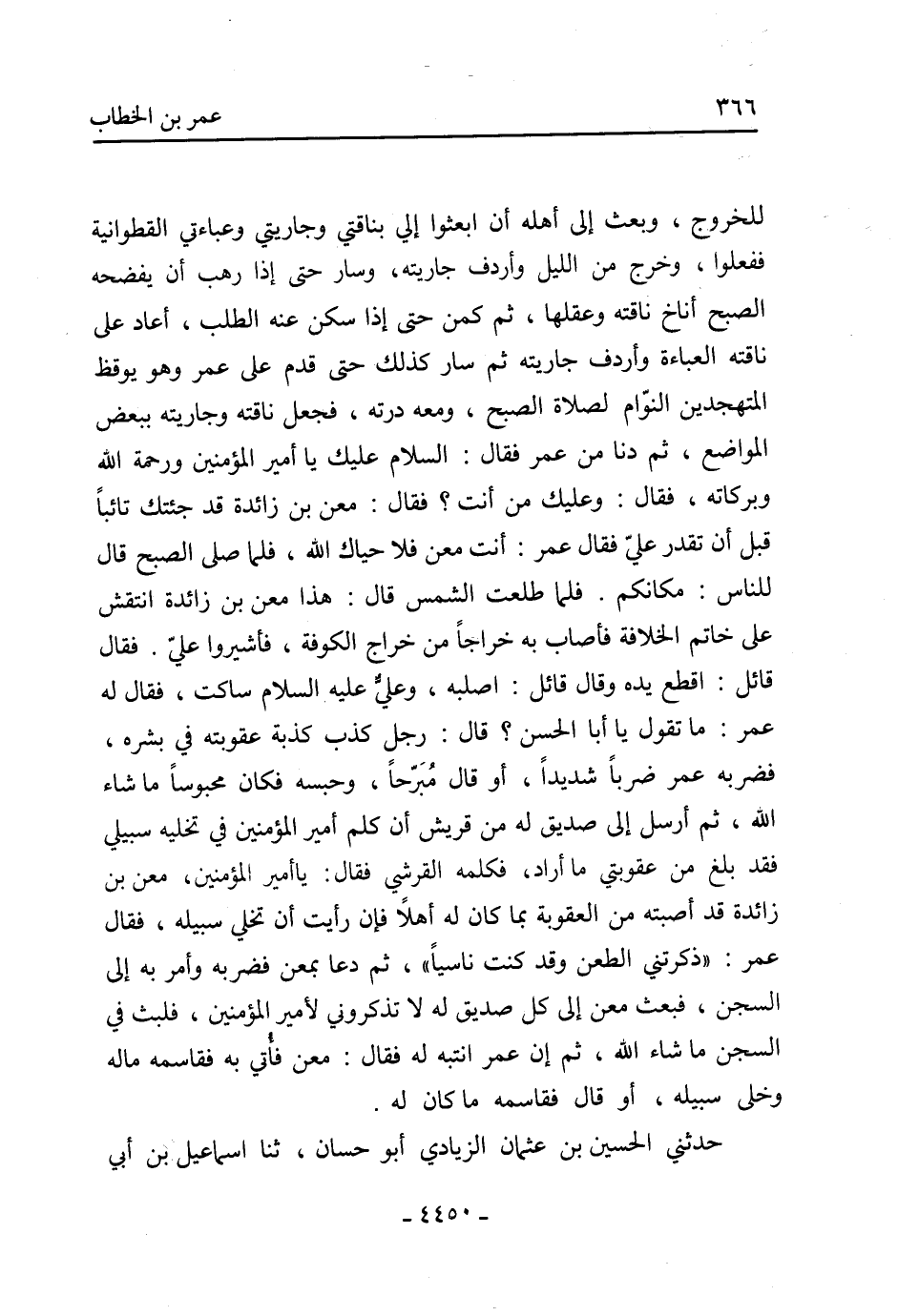 لِلْخُرُوجِ، وَبَعَثَ إِلَى أَهْلِهِ أَنِ ابْعَثُوا إِلَيَّ بِنَاقَتِي وَجَارِيَتِي وَعَبَاءَتِي الْقَطَوَانِيَّةِ فَفَعَلُوا، وَخَرَجَ مِنَ اللَّيْلِ وَأَرْدَفَ جَارِيَتَهُ، وَسَارَ حَتَّى إِذَا رَهِبَ أَنْ يَفْضَحَهُ الصُّبْحُ أَنَاخَ نَاقَتَهُ وَعَقَلَهَا، ثُمَّ كَمَنَ حَتَّى إِذَا سَكَنَ عَنْهُ الطَّلَبُ، أَعَادَ عَلَى نَاقَتِهِ الْعَبَاءَةَ وَأَرْدَفَ جَارِيَتَهُ ثُمَّ سَارَ كَذَلِكَ حَتَّى قَدِمَ عَلَى عُمَرَ وَهُوَ يُوقِظُ الْمُتَهَجِّدِينَ النُّوَّامَ لِصَلاةِ الصُّبْحِ، وَمَعَهُ دِرَّتُهُ، فَجَعَلَ نَاقَتَهُ وَجَارِيَتَهُ بِبَعْضِ الْمَوَاضِعِ، ثُمَّ دَنَا مِنْ عُمَرَ فَقَالَ: السَّلامُ عَلَيْكَ يَا أَمِيرَ الْمُؤْمِنِينَ وَرَحْمَةُ اللَّهِ وَبَرَكَاتُهُ، فَقَالَ: وَعَلَيْكَ مَنْ أَنْتَ؟ فَقَالَ: مَعْنُ بْنُ زَائِدَةَ قَدْ جِئْتُكَ تَائِبًا قَبْلَ أَنْ تَقْدِرَ عَلَيَّ فَقَالَ عُمَرُ: أَنْتَ مَعْنٌ فَلا حَيَّاكَ اللَّهُ، فَلَمَّا صَلَّى الصُّبْحَ قَالَ لِلنَّاسِ: مَكَانَكُمْ. فَلَمَّا طَلَعَتِ الشَّمْسُ قَالَ: هَذَا مَعْنُ بْنُ زَائِدَةَ انْتَقَشَ عَلَى خَاتَمِ الْخِلافَةِ فَأَصَابَ بِهِ خَرَاجًا مِنْ خَرَاجِ الْكُوفَةِ، فَأَشِيرُوا عَلَيَّ. فَقَالَ قَائِلٌ: اقْطَعْ يَدَهُ وَقَالَ قَائِلٌ: اصْلُبْهُ، وَعَلِيٌّ عَلَيْهِ السَّلامُ سَاكِتٌ، فَقَالَ لَهُ عُمَرُ: مَا تَقُولُ يَا أَبَا الْحَسَنِ؟ قَالَ: [رَجُلٌ كَذَبَ كِذْبَةً عُقُوبَتُهُ فِي بَشَرِهِ،] فَضَرَبَهُ عُمَرُ ضَرْبًا شَدِيدًا، أَوْ قَالَ مُبَرِّحًا، وَحَبَسَهُ فَكَانَ مَحْبُوسًا مَا شَاءَ اللَّهُ، ثُمَّ أَرْسَلَ إِلَى صَدِيقٍ لَهُ مِنْ قُرَيْشٍ أَنْ كِلِّمْ أَمِيرَ الْمُؤْمِنِينَ فِي تَخْلِيَةِ سَبِيلِي فَقَدْ بَلَغَ مِنْ عُقُوبَتِي مَا أَرَادَ، فَكَلَّمَهُ الْقُرَشِيُّ فَقَالَ: يَا أَمِيرَ الْمُؤْمِنِينَ، مَعْنُ بْنُ زَائِدَةَ قَدْ أَصَبْتَهُ مِنَ الْعُقُوبَةِ بِمَا كَانَ لَهُ أَهْلا فَإِنْ رَأَيْتَ أَنْ تُخَلِّيَ سَبِيلَهُ، فَقَالَ عُمَرُ: «ذَكَّرْتَنِي الطَّعْنَ وَقَدْ كُنْتُ نَاسِيًا» ، ثُمَّ دعا بمعن فضربه وَأَمَرَ بِهِ إِلَى السِّجْنِ، فَبَعَثَ مَعْنٌ إِلَى كُلِّ صَدِيقٍ لَهُ لا تَذْكُرُونِي لأَمِيرِ الْمُؤْمِنِينَ، فَلَبِثَ فِي السِّجْنِ مَا شَاءَ اللَّهُ، ثُمَّ إِنَّ عُمَرَ انْتَبَهَ لَهُ فَقَالَ: مَعْنُ فَأُتِيَ بِهِ فَقَاسَمَهُ مَالَهُ وَخَلَّى سَبِيلَهُ، أَوْ قَالَ فقاسمه ما كان له.