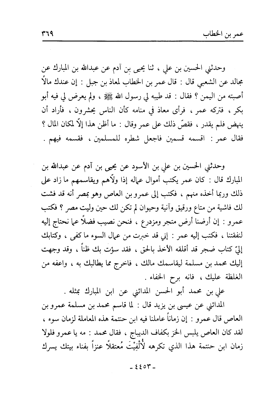 وَحَدَّثَنِي الْحُسَيْن بْن عَلِيّ بْن الأسود عَن يَحْيَى بْنِ آدَمَ عَنْ عَبْدِ اللَّهِ بْنِ الْمُبَارَكِ قَالَ: كَانَ عُمَرُ يَكْتُبُ أَمْوَالَ عُمَّالِهِ إِذَا وَلاهُمْ وَيُقَاسِمَهُمْ مَا زَادَ عَلَى ذَلِكَ وَرُبَّمَا أَخَذَهُ مِنْهُمْ، فَكَتَبَ إِلَى عَمْرِو بْنِ الْعَاصِ وَهُوَ بِمِصْرَ أَنَّهُ قَدْ فَشَتْ لَكَ فَاشِيَةٌ مِنْ مَتَاعٍ وَرَقِيقٍ وَآنِيَةٍ وَحَيَوَانٍ لَمْ تَكُنْ لَكَ حِينَ وُلِّيتَ مِصْرَ؟ فَكَتَبَ عَمْرٌو: إِنَّ أَرْضَنَا أَرْضُ مَتْجَرٍ وَمُزْدَرَعٍ، فَنَحْنُ نُصِيبُ فَضْلا عَمَّا نَحْتَاجُ إِلَيْهِ لِنَفَقَتِنَا، فَكَتَبَ إِلَيْهِ عُمَرُ: إِنِّي قَدْ خُبِّرْتُ مِنْ عُمَّالِ السُّوءِ مَا كَفَى، وَكِتَابُكَ إِلَيَّ كِتَابُ ضَجِرٍ قَدْ أَقْلَقَهُ الأَخْذُ بِالْحَقِّ، فَقَدْ سُؤْتُ بِكَ ظَنًّا، وَقَدْ وَجَّهْتُ إِلَيْك مُحَمَّد بن مسلمة لِيُقَاسِمَكَ مَالَكَ، فَاخْرُجْ مِمَّا يُطَالِبُكَ بِهِ، وَاعْفِهِ مِنَ الْغِلْظَةِ عَلَيْكَ، فَإِنَّهُ بَرِحَ الْخَفَاءَ.