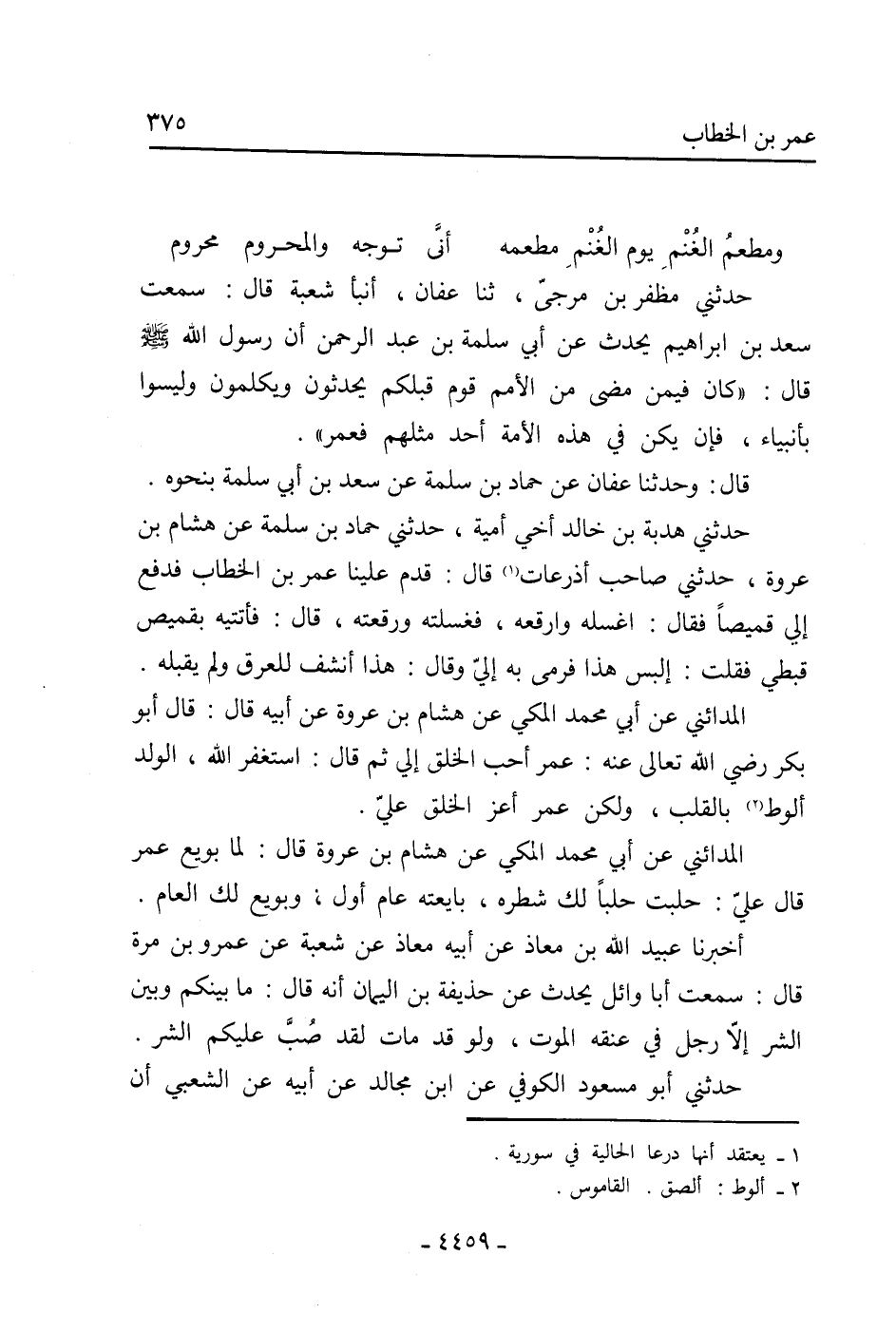 حَدَّثَنِي مُظَفَّرُ بْنُ مُرَجِّي، ثنا عَفَّانُ، أنبأ شُعْبَةُ قَالَ: سَمِعْتُ سَعْدَ بْنَ إِبْرَاهِيمَ يُحَدِّثُ عَنْ أَبِي سَلَمَةَ بْنِ عَبْدِ الرَّحْمَنِ أَنَّ رَسُولَ اللَّهِ صَلَّى اللَّهُ عَلَيْهِ وَسَلَّمَ [قَالَ: «كَانَ فِيمَنْ مَضَى مِنَ الأُمَمِ قَوْمٌ قَبْلَكُمْ يُحَدِّثُونَ وَيُكَلِّمُونَ وَلَيْسُوا بِأَنْبِيَاءَ، فَإِنْ يَكُنْ فِي هَذِهِ الأُمَّةِ أَحَدٌ مِثْلُهُمْ فَعُمَرُ» ] .