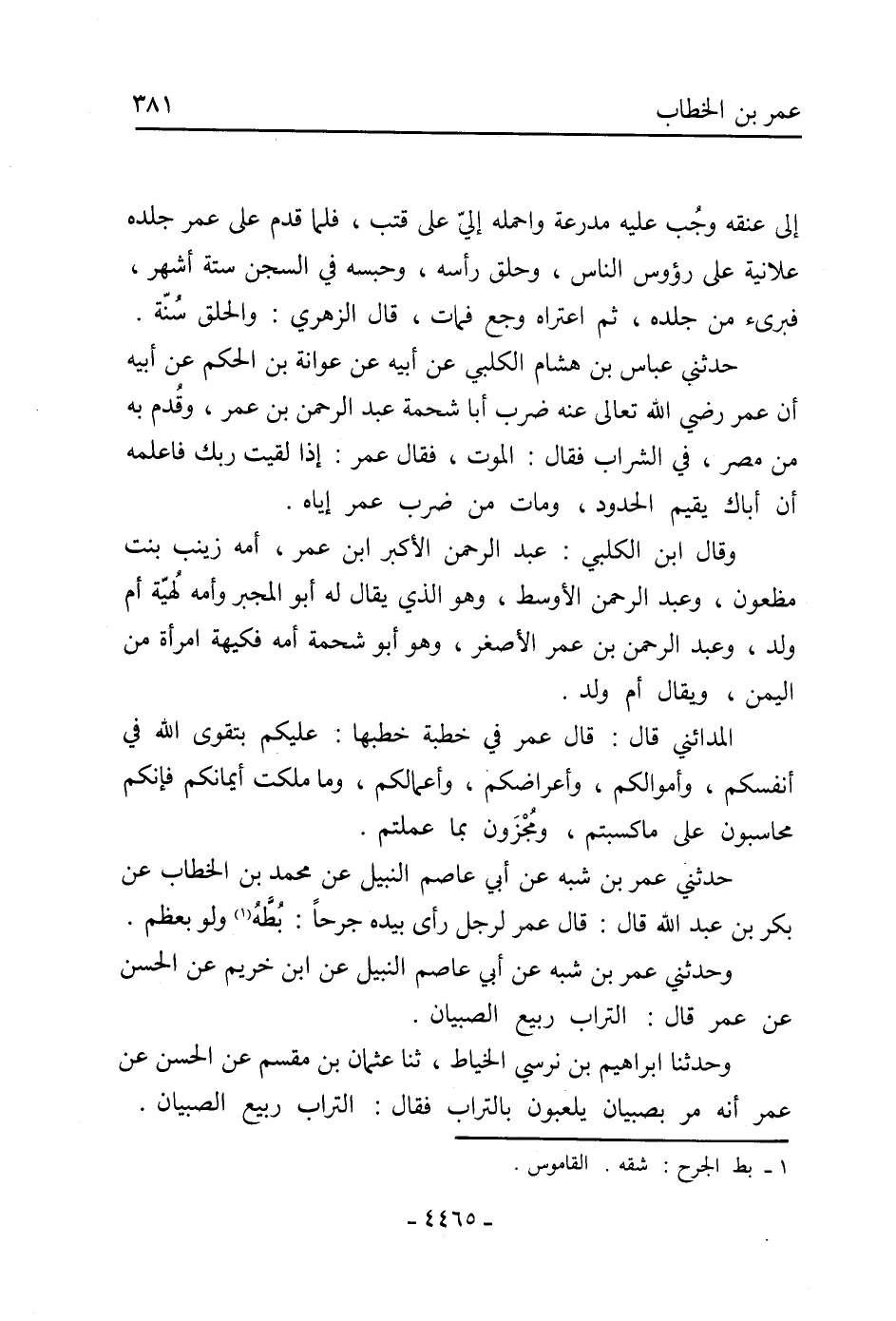 حَدَّثَنِي عُمَر بْن شَبَّةَ عَن أَبِي عَاصِم النَّبِيلِ عَنْ مُحَمَّدِ بْنِ الْخَطَّابِ عَنْ بَكْرِ بْنِ عَبْدِ اللَّهِ قَالَ: قَالَ عُمَرُ لِرَجُلٍ رَأَى بِيَدِهِ جُرْحًا: بُطَّهُ [1] وَلَوْ بِعَظْمٍ.