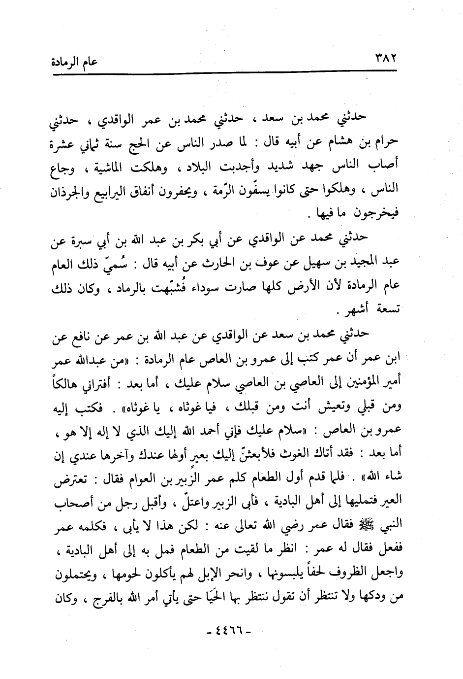 حَدَّثَنِي مُحَمَّدُ بْنُ سَعْدٍ عَنِ الْوَاقِدِيِّ عَنْ عَبْدِ اللَّهِ بْنِ عُمَرَ عَنْ نَافِعٍ عَنِ ابْنِ عُمَرَ أَنَّ عُمَرَ كَتَبَ إِلَى عَمْرِو بْنِ الْعَاصِ عَامَ الرَّمَادَةِ: «مِنْ عَبْدِ اللَّهِ عُمَرَ أَمِيرِ الْمُؤْمِنِينَ إِلَى الْعَاصِي بْنِ الْعَاصِي سَلامٌ عَلَيْكَ، أَمَّا بَعْدُ: أَفَتَرَانِي هَالِكًا وَمَنْ قِبَلِي وَتَعِيشُ أَنْتَ وَمَنْ قِبَلَكَ، فَيَا غَوْثَاهُ، يَا غَوْثَاهُ» . فَكَتَبَ إِلَيْهِ عَمْرُو بْنُ الْعَاصِ: «سَلامٌ عَلَيْكَ فَإِنِّي أَحْمَدُ اللَّهَ إِلَيْكَ الَّذِي لا إِلَهَ إِلا هُوَ، أَمَّا بَعْدُ: فَقَدْ أَتَاكَ الْغَوْثُ فَلأَبْعَثَنَّ إِلَيْكَ بِعِيرٍ أَوَّلُهَا عِنْدَكَ وَآخِرُهَا عِنْدِي إِنْ شَاءَ اللَّهُ» . فَلَمَّا قَدِمَ أَوَّلُ الطَّعَامِ كَلَّمَ عُمَرُ الزبير بن العوام فقال: تعترض العير فتميلها إِلَى أَهْلِ الْبَادِيَةِ، فَأَبَى الزُّبَيْرُ وَاعْتَلَّ، وَأَقْبَلَ رَجُلٌ مِنْ أَصْحَابِ النَّبِيّ صَلَّى اللَّهُ عَلَيْهِ وَسَلَّمَ فَقَالَ عُمَرُ رَضِيَ اللَّهُ تَعَالَى عَنْهُ: لَكِنَّ هَذَا لا يَأْبَى، فَكَلَّمَهُ عُمَرُ فَفَعَلَ فَقَالَ لَهُ عُمَرُ: انْظُرْ مَا لَقِيتَ مِنَ الطَّعَامِ فَمِلْ بِهِ إِلَى أَهْلِ الْبَادِيَةِ، وَاجْعَلِ الظروف لحفا يلبسونها، وانحر الإبل لهم يأكلون لحومها، ويحتملون مِنْ وَدَكِهَا وَلا تَنْتَظِرْ أَنْ تَقُولَ نَنْتَظِرُ بِهَا الْحَيَا حَتَّى يَأْتِيَ أَمْرُ اللَّهِ بِالْفَرَجِ، وكان