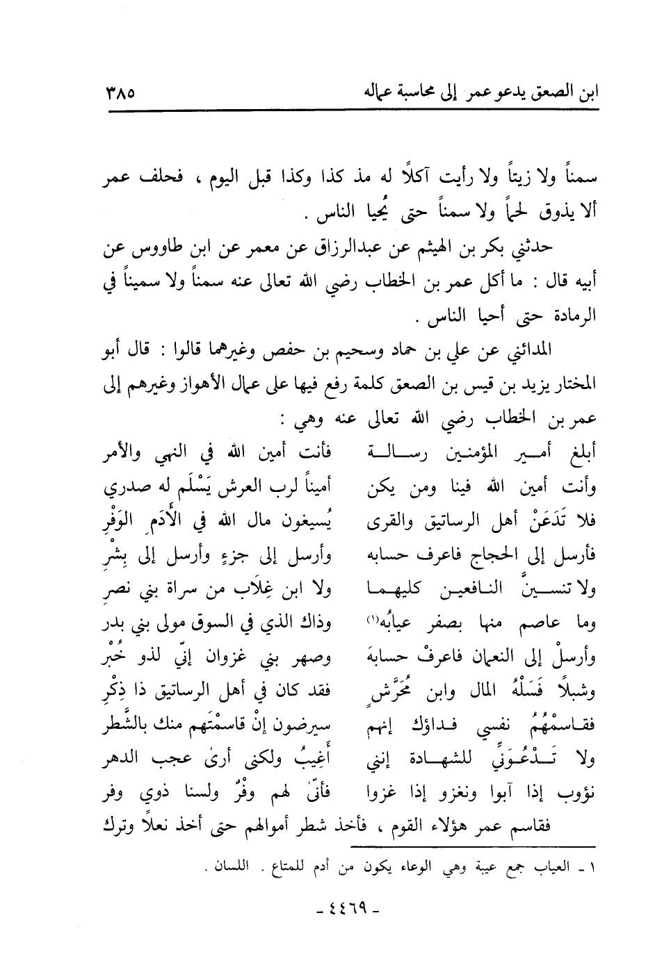 [ابن الصعق يدعو عمر إلى محاسبة عماله]