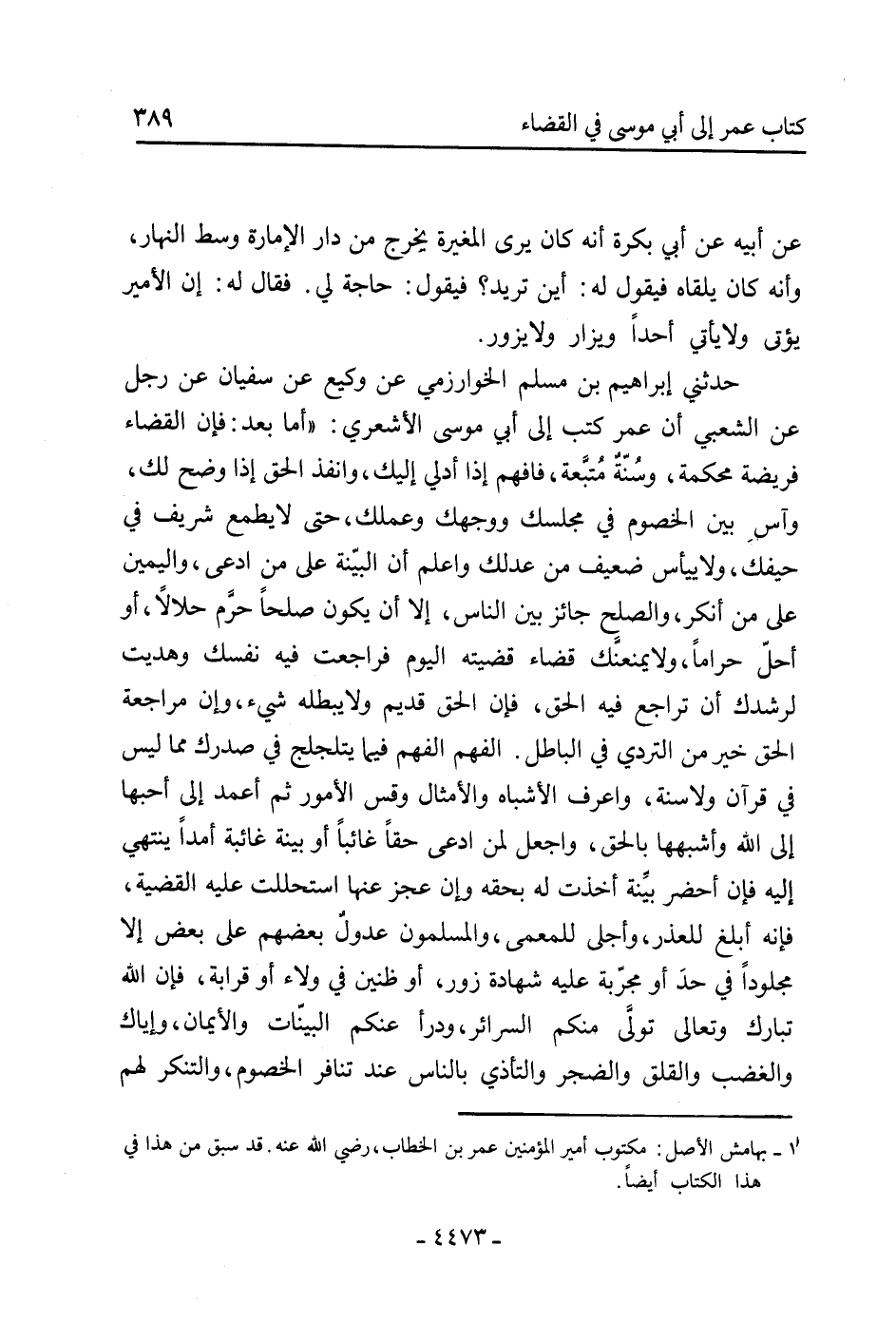 حَدَّثَنِي إِبْرَاهِيمُ بْنُ مُسْلِمٍ الْخَوَارِزْمِيُّ عَنْ وَكِيعٍ عَنْ سُفْيَانَ عَنْ رَجُلٍ عَنِ الشَّعْبِيِّ أَنَّ عُمَرَ [1] كَتَبَ إِلَى أَبِي مُوسَى الأَشْعَرِيِّ: «أَمَّا بَعْدُ: فَإِنَّ الْقَضَاءَ فَرِيضَةٌ مُحْكَمَةٌ، وَسُنَّةٌ مُتَّبَعَةٌ، فَافْهَمْ إِذَا أُدْلِيَ إِلَيْكَ، وَانْفِذِ الْحَقَّ إِذَا وَضَحَ لَكَ، وَآسِ بَيْنَ الْخُصُومِ فِي مَجْلِسِكَ ووجهك وعملك، حَتَّى لا يَطْمَعَ شَرِيفٌ فِي حَيْفِكَ، وَلا يَيْأَسْ ضَعِيفٌ مِنْ عَدْلِكَ وَاعْلَمْ أَنَّ الْبَيِّنَةَ عَلَى مَنِ ادَّعَى، وَالْيَمِينَ عَلَى مَنْ أَنْكَرَ، وَالصُّلْحُ جَائِزٌ بَيْنَ النَّاسِ، إِلا أَنْ يَكُونَ صُلْحًا حَرَّمَ حَلالا، أَوِ أَحَلَّ حَرَامًا، وَلا يَمْنَعَنَّكَ قَضَاءٌ قَضَيْتَهُ الْيَوْمَ فَرَاجَعْتَ فِيهِ نَفْسَكَ وَهُدِيتَ لِرُشْدِكَ أَنْ تُرَاجِعَ فِيهِ الْحَقَّ، فَإِنَّ الْحَقَّ قَدِيمٌ وَلا يُبْطِلُهُ شَيْءٌ، وَإِنَّ مُرَاجَعَةَ الْحَقِّ خَيْرٌ مِنَ التَّرَدِّي فِي الْبَاطِلِ. الْفَهْمَ الْفَهْمَ فِيمَا يَتَلَجْلَجُ فِي صَدْرِكَ مِمَّا لَيْسَ فِي قُرْآنٍ وَلا سُنَّةٍ، وَاعْرِفِ الأَشْبَاهَ وَالأَمْثَالَ وَقِسِ الأُمُورَ ثُمَّ اعْمِدْ إِلَى أَحَبِّهَا إِلَى اللَّهِ وَأَشْبَهِهَا بِالْحَقِّ، وَاجْعَلْ لِمَنِ ادَّعَى حَقًّا غائبا أو بينة غائبة أَمَدًا يَنْتَهِي إِلَيْهِ فَإِنْ أَحْضَرَ بَيِّنَةً أَخَذْتَ لَهُ بِحَقِّهِ وَإِنْ عَجَزَ عَنْهَا اسْتَحْلَلْتَ عَلَيْهِ الْقَضِيَّةَ، فَإِنَّهُ أَبَّلُغ لِلْعُذْرِ، وَأَجْلَى لِلْمَعْمَى، وَالْمُسْلِمُونَ عُدُولٌ بَعْضُهُمْ عَلَى بَعْضٍ إِلا مَجْلُودًا فِي حَدٍّ أَوْ مُجَرَّبَةً عَلَيْهِ شَهَادَةُ زُورٍ، أَوْ ظَنِينَ فِي وَلاءٍ أَوْ قَرَابَةٍ، فَإِنَّ اللَّهَ تَبَارَكَ وَتَعَالَى تَوَلَّى مِنْكُمُ السَّرَائِرَ، وَدَرَأَ عَنْكُمُ الْبَيِّنَاتِ وَالأَيْمَانَ، وَإِيَّاكَ وَالْغَضَبَ وَالْقَلَقَ وَالضَّجَرَ وَالتَّأَذِّيَ بالناس عند تنافر الخصوم، والتنكر لهم