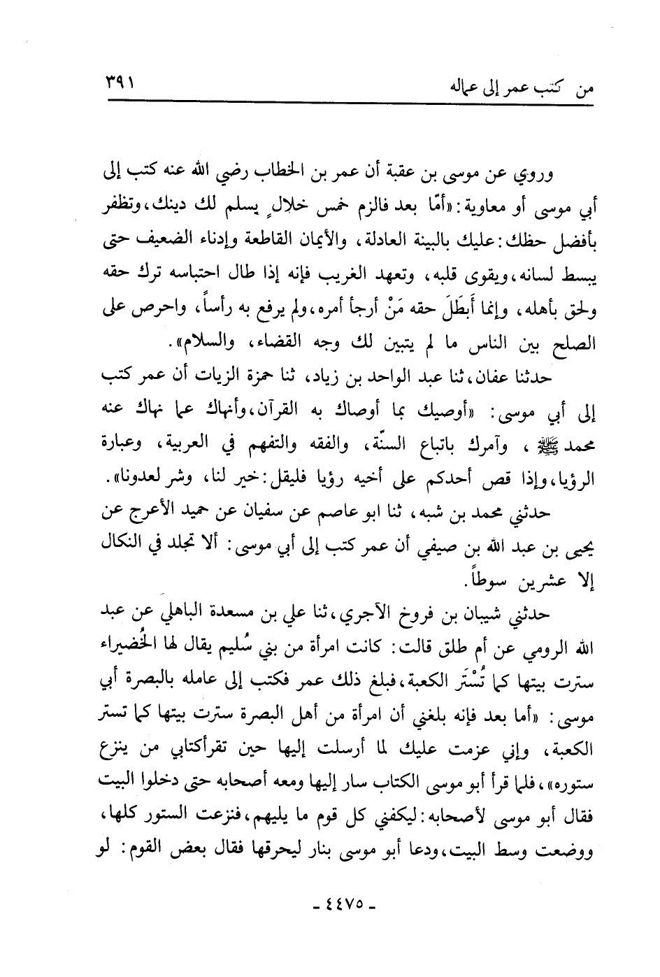 حَدَّثَنَا عَفَّانُ، ثنا عَبْدُ الْوَاحِدِ بْنُ زِيَادٍ، ثنا حَمْزَةُ الزَّيَّاتُ أَنَّ عُمَرَ كَتَبَ إِلَى أَبِي مُوسَى: «أُوصِيكَ بِمَا أَوْصَاكَ بِهِ الْقُرْآنُ، وَأَنْهَاكَ عَمَّا نَهَاكَ عَنْهُ مُحَمَّدٌ صَلَّى اللَّهُ عَلَيْهِ وَسَلَّمَ، وَآمُرُكَ بِاتِّبَاعِ السُّنَّةِ، وَالْفِقْهِ وَالتَّفَهُّمِ فِي الْعَرَبِيَّةِ، وَعِبَارَةِ الرُّؤْيَا، وَإِذَا قَصَّ أَحَدُكُمْ عَلَى أَخِيهِ رُؤْيَا فَلْيَقُلْ: خَيْرٌ لَنَا، وَشَرٌّ لِعَدُوِّنَا» .