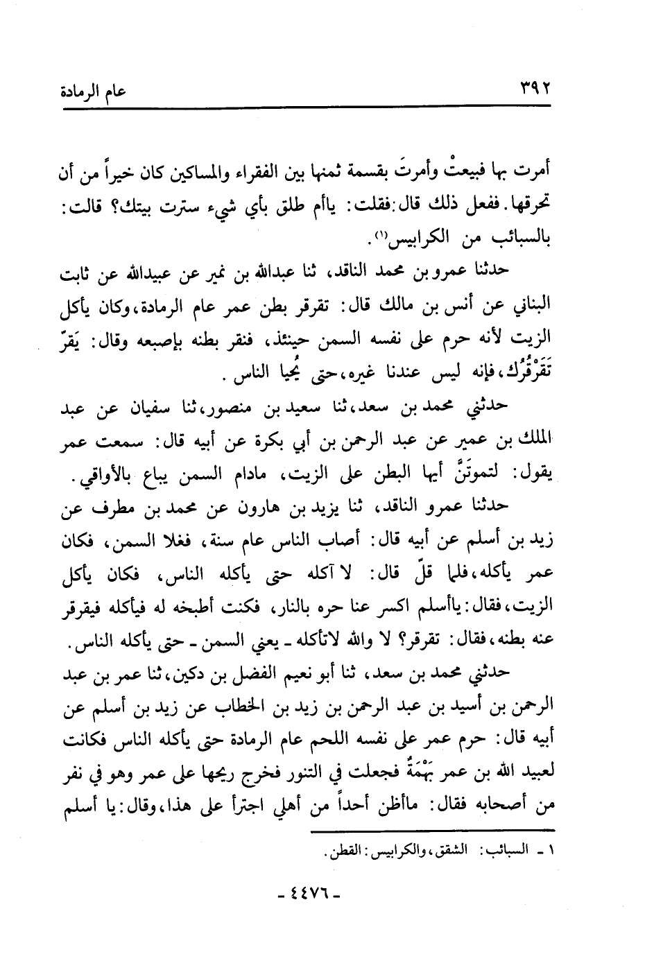 حَدَّثَنَا عَمْرٌو النَّاقِدُ، ثنا يَزِيدُ بْنُ هَارُونَ عَنْ مُحَمَّدِ بْنِ مُطَرِّفٍ عَنْ زَيْدِ بْنِ أَسْلَمَ عَنْ أَبِيهِ قَالَ: أَصَابَ النَّاسُ عَامُ سِنَةٍ، فَغَلا السَّمْنُ، فَكَانَ عُمَرُ يَأْكُلُهُ، فَلَمَّا قَلَّ قَالَ: لا آكُلُهُ حَتَّى يَأْكُلَهُ النَّاسُ، فَكَانَ يَأْكُلُ الزَّيْتَ، فَقَالَ: يَا أَسْلَمَ اكْسِرْ عَنَّا حَرَّهُ بِالنَّارِ، فَكُنْتُ أَطْبُخُهُ لَهُ فَيَأْكُلُهُ فَيُقَرْقِرُ عَنْهُ بَطْنُهُ، فَقَالَ: تُقَرْقِرُ؟ لا وَاللَّهِ لا تَأْكُلَهُ- يَعْنِي السَّمْنَ- حَتَّى يَأْكُلَهُ النَّاسُ.