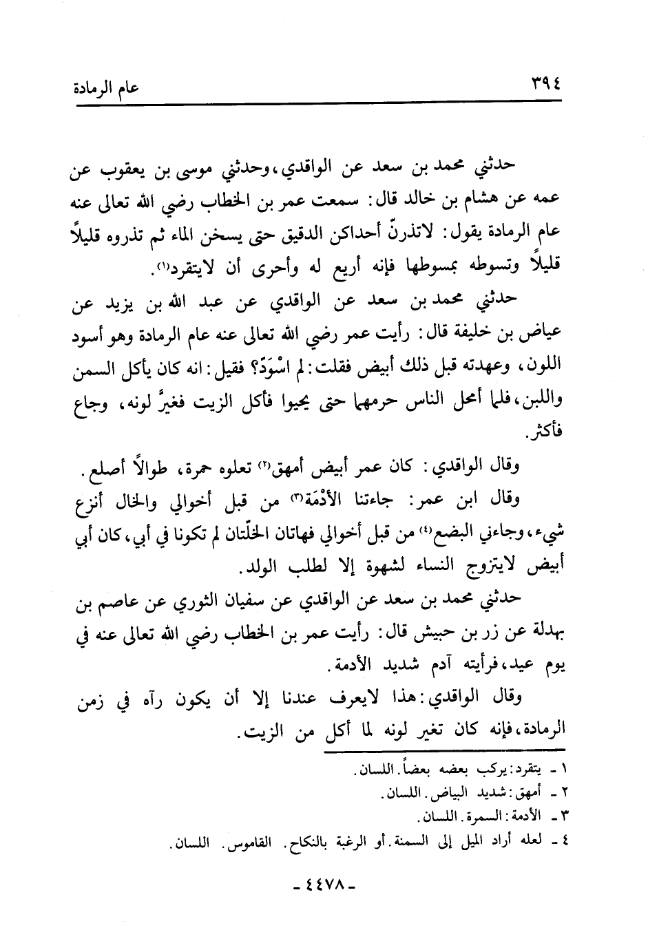 حَدَّثَنِي مُحَمَّدُ بْنُ سَعْدٍ عَنِ الْوَاقِدِيِّ عَنْ عَبْدِ اللَّهِ بْنِ يَزِيدَ عَنْ عِيَاضِ بْنِ خَلِيفَةَ قَالَ: رَأَيْتُ عُمَرَ رَضِيَ اللَّهُ تَعَالَى عَنْهُ عَامَ الرَّمَادَةِ وَهُوَ أَسْوَدُ اللَّوْنِ، وَعَهِدْتَهُ قَبْلَ ذَلِكَ أَبْيَضَ فَقُلْتُ: لِمَ اسْوَدَّ؟ فَقِيلَ: إِنَّهُ كَانَ يَأْكُلُ السَّمْنَ وَاللَّبَنَ، فَلَمَّا أَمْحَلَ النَّاسُ حَرَّمَهُمَا حَتَّى يَحْيَوْا فَأَكَلَ الزَّيْتَ فَغَيَّرَ لَوْنَهُ، وَجَاعَ فَأَكْثَرَ.