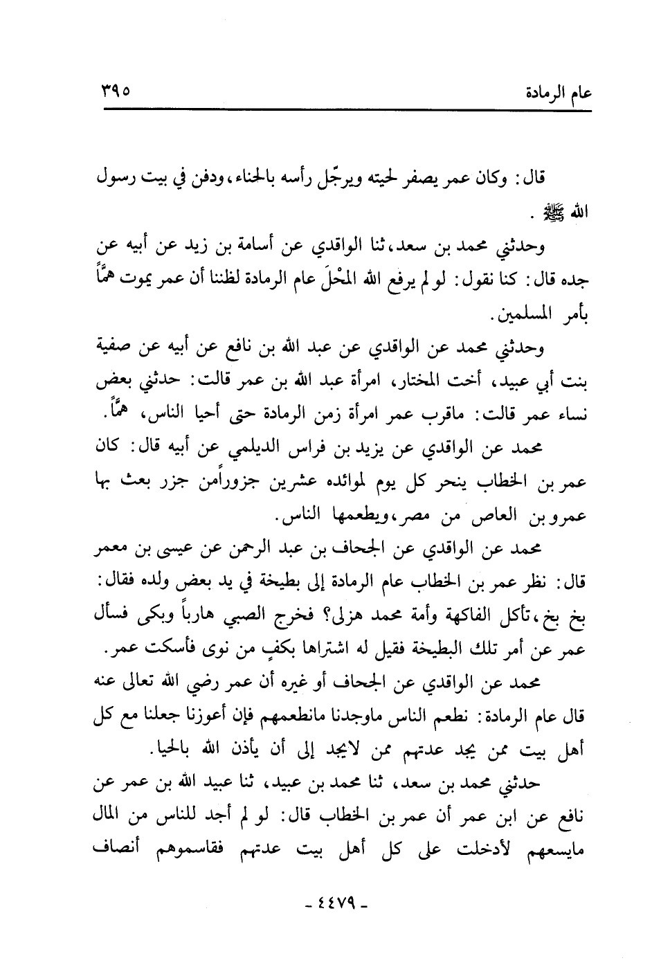 وَحَدَّثَنِي مُحَمَّد عَنِ الْوَاقِدِيِّ عَنْ عَبْدِ اللَّهِ بْنِ نَافِعٍ عَنْ أَبِيهِ عَنْ صَفِيَّةَ بِنْتِ أَبِي عُبَيْدٍ، أُخْتِ الْمُخْتَارِ، امْرَأَةِ عَبْدِ اللَّهِ بْنِ عُمَرَ قَالَتْ: حَدَّثَنِي بَعْضُ نِسَاءِ عُمَرَ قَالَتْ: مَا قَرُبَ عُمَرُ امْرَأَةً زَمَنَ الرَّمَادَةِ حَتَّى أَحْيَا النَّاسَ، هَمًّا.