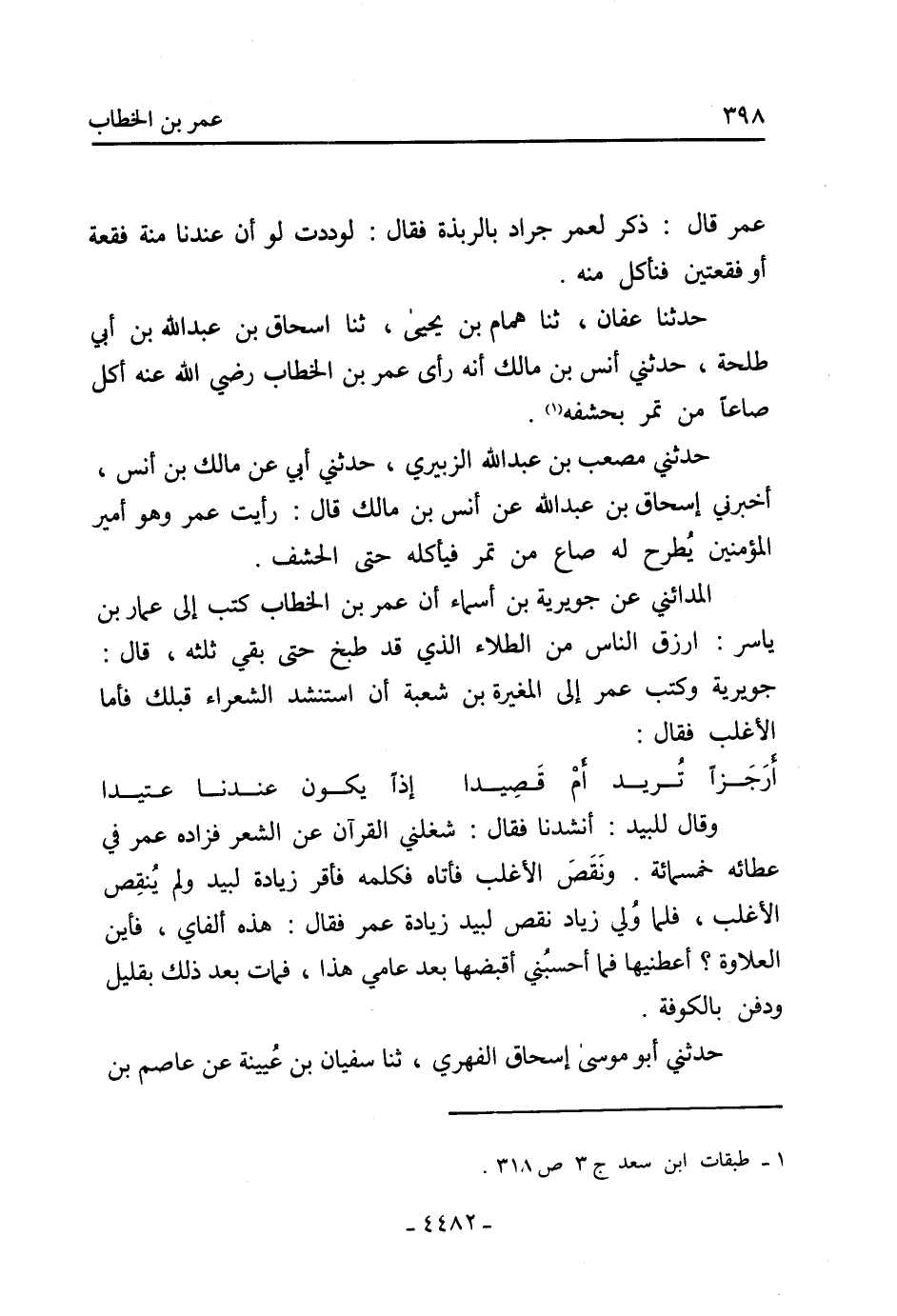 حَدَّثَنَا عَفَّانُ، ثنا هَمَّامُ بْنُ يَحْيَى، ثنا إِسْحَاقُ بْنُ عَبْدِ اللَّهِ بْنِ أَبِي طَلْحَةَ، حَدَّثَنِي أَنَسُ بْنُ مَالِكٍ أَنَّهُ رَأَى عُمَرَ بْنَ الْخَطَّابِ رَضِيَ اللَّهُ عَنْهُ أَكَلَ صَاعًا مِنْ تَمْرٍ بِحَشَفِهِ [1] .