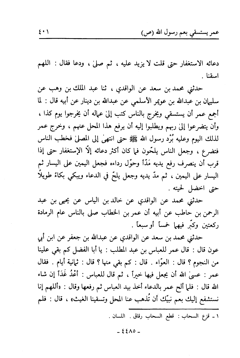 حَدَّثَنِي مُحَمَّدُ بْنُ سَعْدٍ عَنِ الْوَاقِدِيِّ عَنْ عَبْدِ اللَّهِ بْنِ جَعْفَرٍ عَنِ ابْنِ أَبِي عَوْنٍ قَالَ: قَالَ عُمَرُ لِلْعَبَّاسِ بْنِ عَبْدِ الْمُطَّلِبِ: يَا أَبَا الْفَضْلِ كَمْ بَقِيَ عَلَيْنَا مِنَ النُّجُومِ؟ قَالَ: الْعَوَّاءُ. قَالَ: كَمْ بَقِيَ مِنْهَا؟ قَالَ: ثَمَانِيَةُ أَيَّامٍ. فَقَالَ عُمَرُ: عَسَى اللَّهُ أَنْ يَجْعَلَ فِيهَا خَيْرًا، ثُمَّ قَالَ لِلْعَبَّاسِ: أَعِدَّ غَدًا إِنْ شَاءَ اللَّهُ قَالَ: فَلَمَّا أَلَحَّ عُمَرُ بِالدُّعَاءِ أَخَذَ بِيَدِ الْعَبَّاسِ ثُمَّ رَفَعَهَا وَقَالَ: «اللَّهُمَّ إِنَّا نَسْتَشْفِعُ إِلَيْكَ بِعَمِّ نَبِيِّكَ أَنْ تُذْهِبَ عَنَّا الْمَحْلَ وَتَسْقِيَنَا الْغَيْثَ» ، قَالَ: فَلَمْ